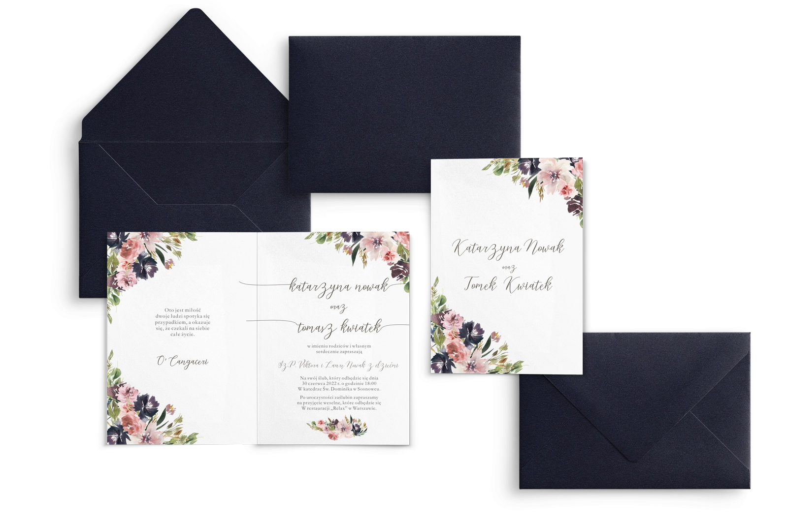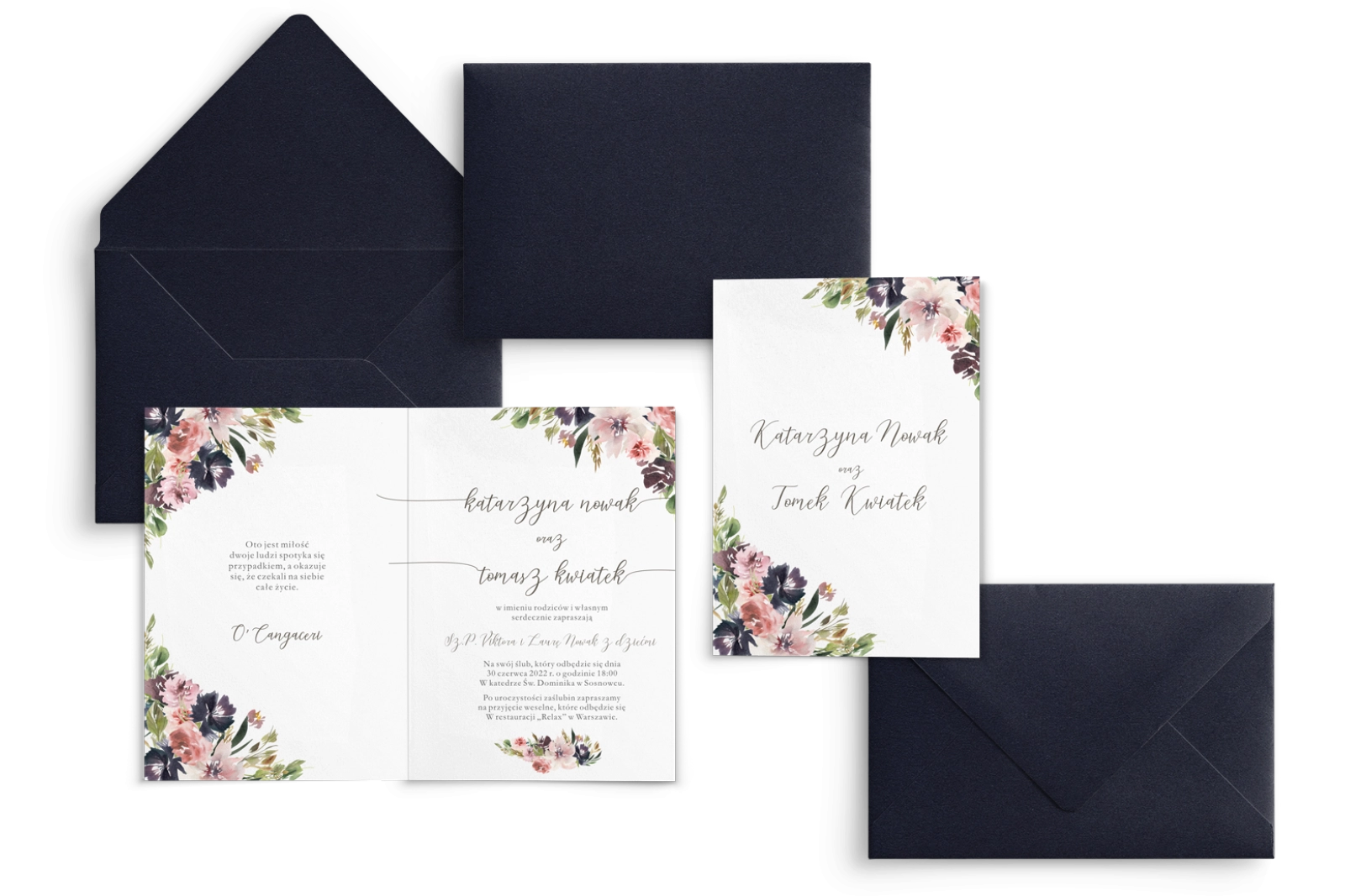 Wszystkie treści zaproszenia oraz dodatkowych wkładek są dowolnie personalizowane. Możesz zmienić każdą treść na swoim zaproszeniu. Podczas wypełniania Formularza Personalizacji opisz nam jak chcesz, aby wyglądało Twoje zaproszenie. Grafik przygotuje projekt skrojony specjalnie dla Ciebie.