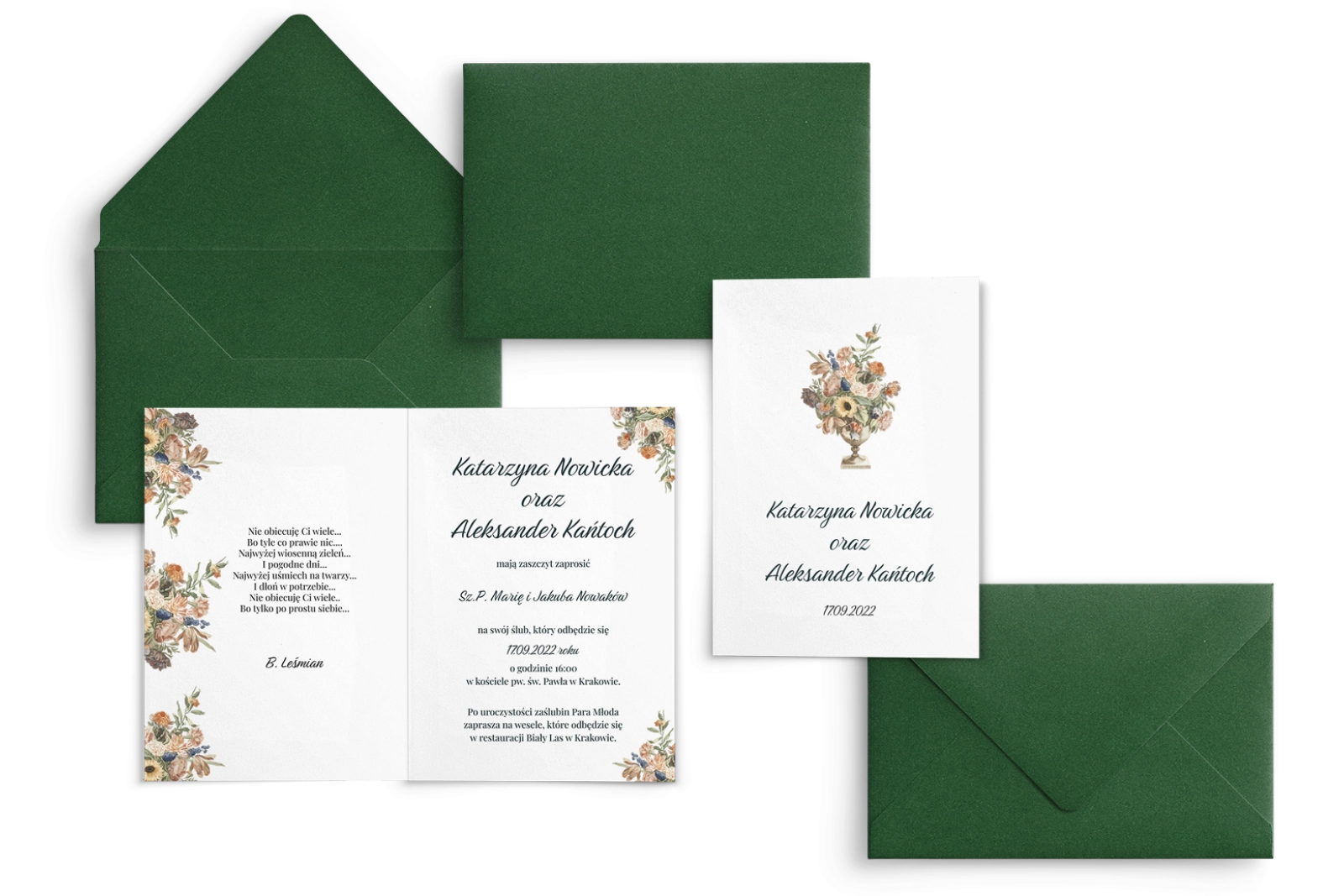 Próbka zawiera wybrany wzór zaproszenia, podklejkę oraz dodatki zgodne z konfiguracją. Rodzaj papieru dobierany jest losowo. Jeśli zamówienie obejmuje dodatki ślubne, ich wzory również są losowe, aby pokazać różnorodność oferty. Do każdej próbki dołączamy próbniki papierów, by ułatwić wybór i upewnić się, że spełnią one Twoje oczekiwania.