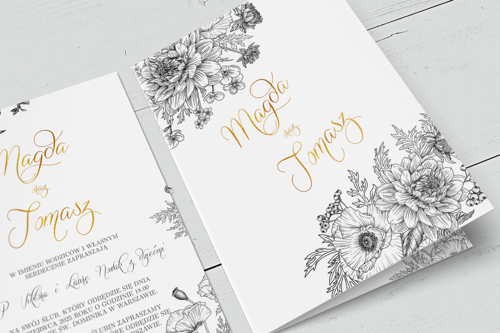 Kolekcja Adore przeznaczona jest dla Par, które cenią sobie prostotę a zarazem elegancję. Delikatne szkice kwiatowe połączone ze złotem tworzą niepowtarzalny efekt końcowy zaproszenia.