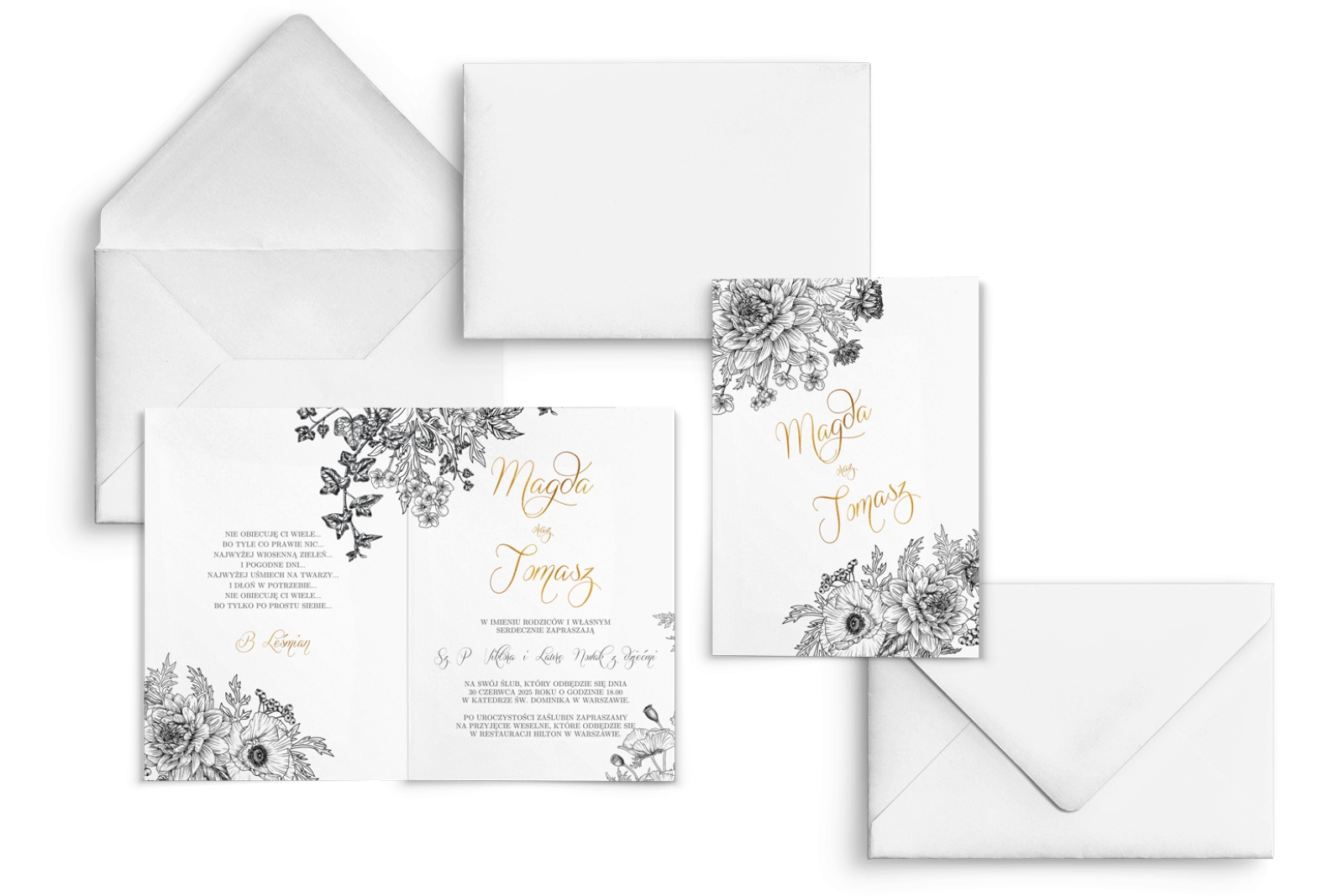 Kolekcja Adore przeznaczona jest dla Par, które cenią sobie prostotę a zarazem elegancję. Delikatne szkice kwiatowe połączone ze złotem tworzą niepowtarzalny efekt końcowy zaproszenia.