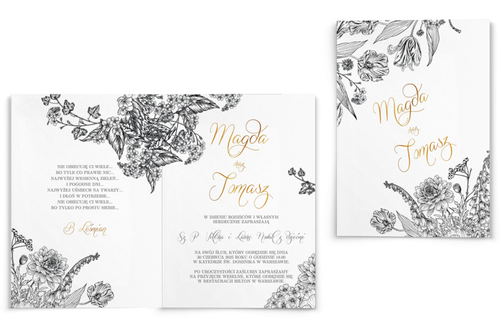 Kolekcja Adore przeznaczona jest dla Par, które cenią sobie prostotę a zarazem elegancję. Delikatne szkice kwiatowe połączone ze złotem tworzą niepowtarzalny efekt końcowy zaproszenia.