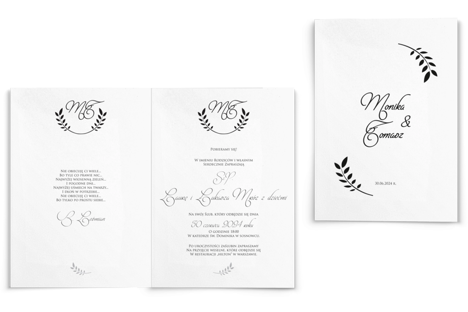 Wszystkie treści zaproszenia oraz dodatkowych wkładek są dowolnie personalizowane. Możesz zmienić każdą treść na swoim zaproszeniu. Podczas wypełniania Formularza Personalizacji opisz nam jak chcesz, aby wyglądało Twoje zaproszenie. Grafik przygotuje projekt skrojony specjalnie dla Ciebie.