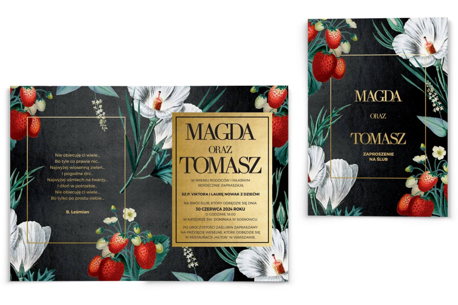 Romantyczne zaproszenia ślubne z kwiatami oraz owocami truskawek pod złotą ramką.