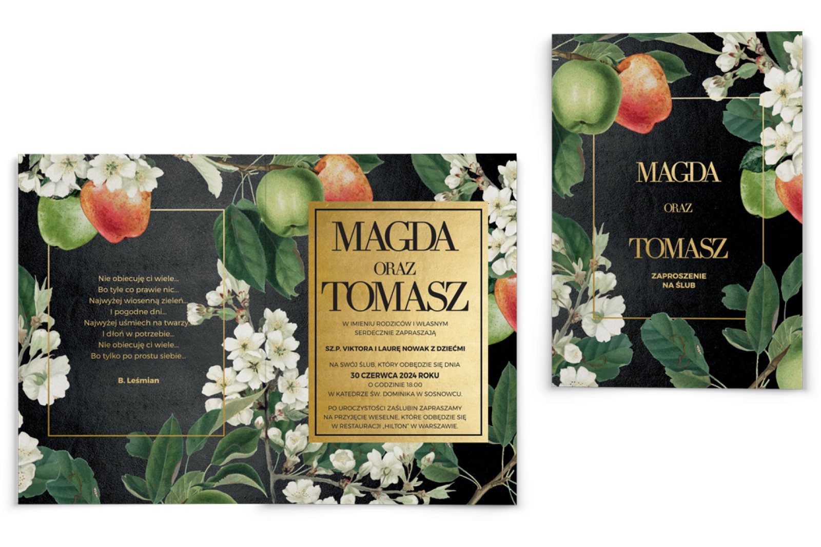 Romantyczne zaproszenia ślubne z kwiatami oraz jabłkami pod złotą ramką.