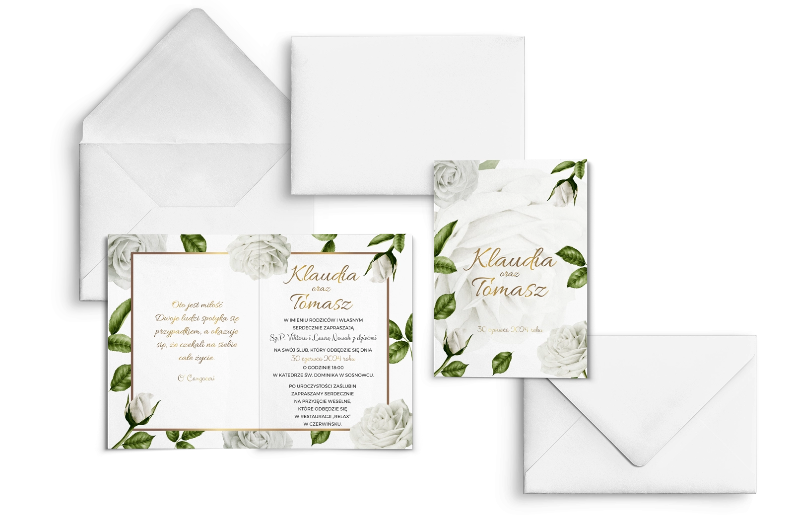 Eleganckie zaproszenia ślubne w których białe róże otulają złotą ramkę. Drukowane na grubych papierach o różnych fakturach.