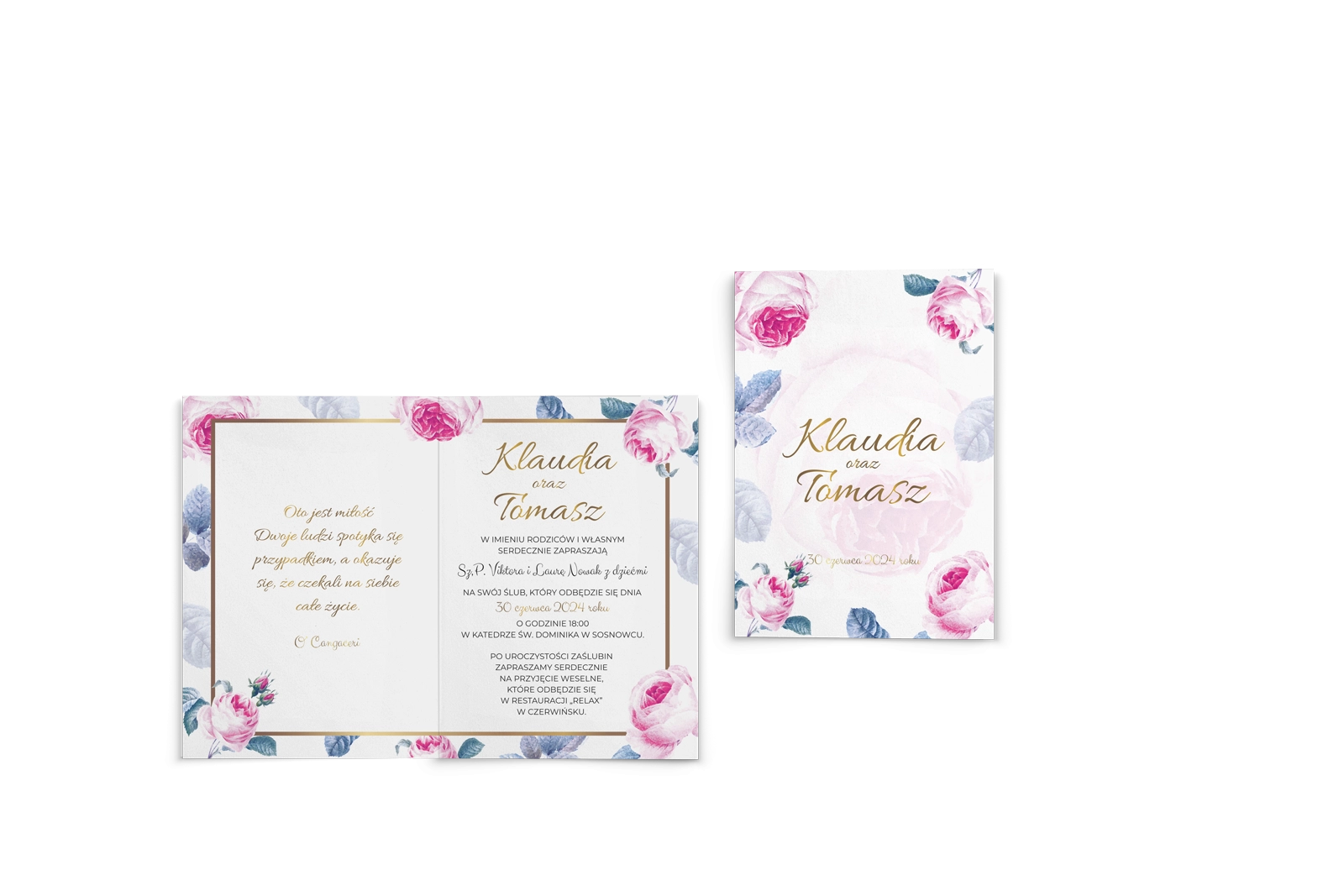 Eleganckie zaproszenia ślubne w których różowe róże otulają złotą ramkę. Drukowane na grubych papierach o różnych fakturach.