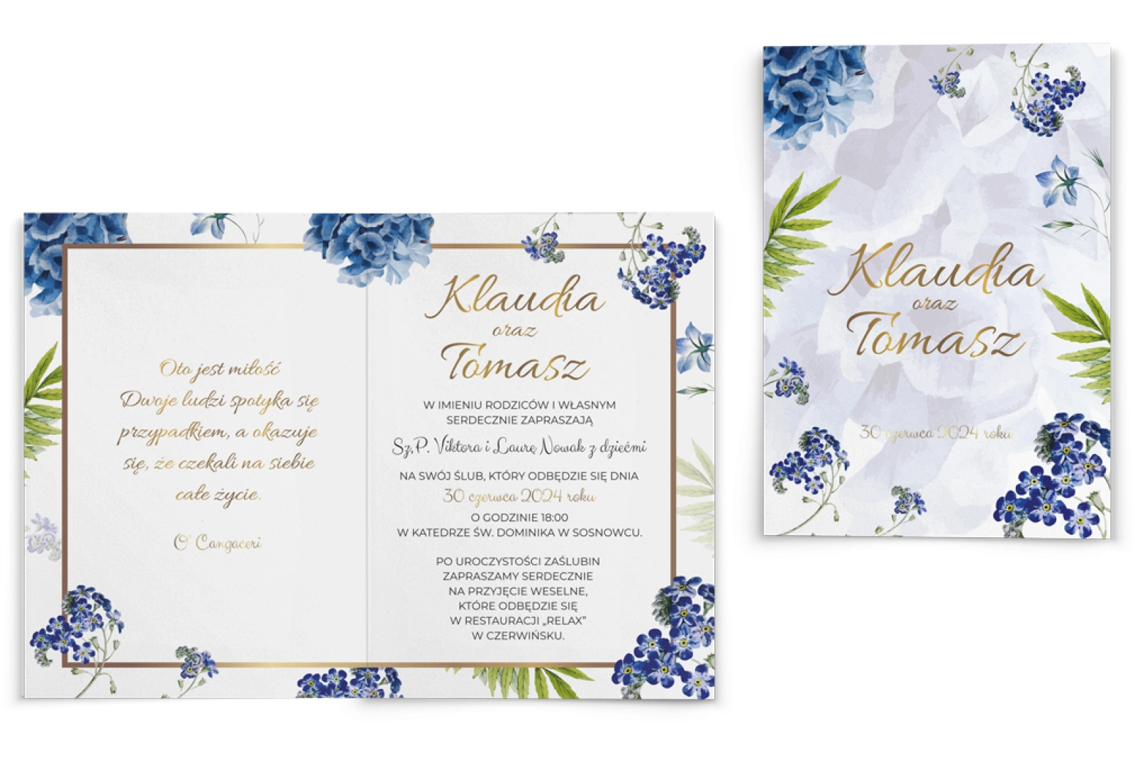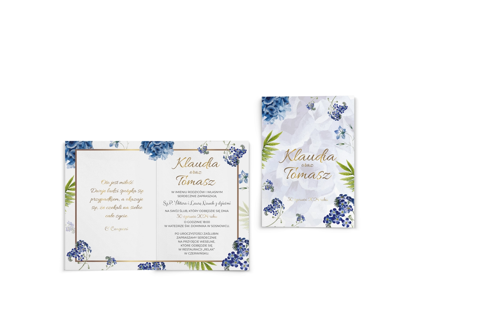 Eleganckie zaproszenia ślubne w których niebieskie hortensje otulają złotą ramkę. Drukowane na grubych papierach o różnych fakturach.