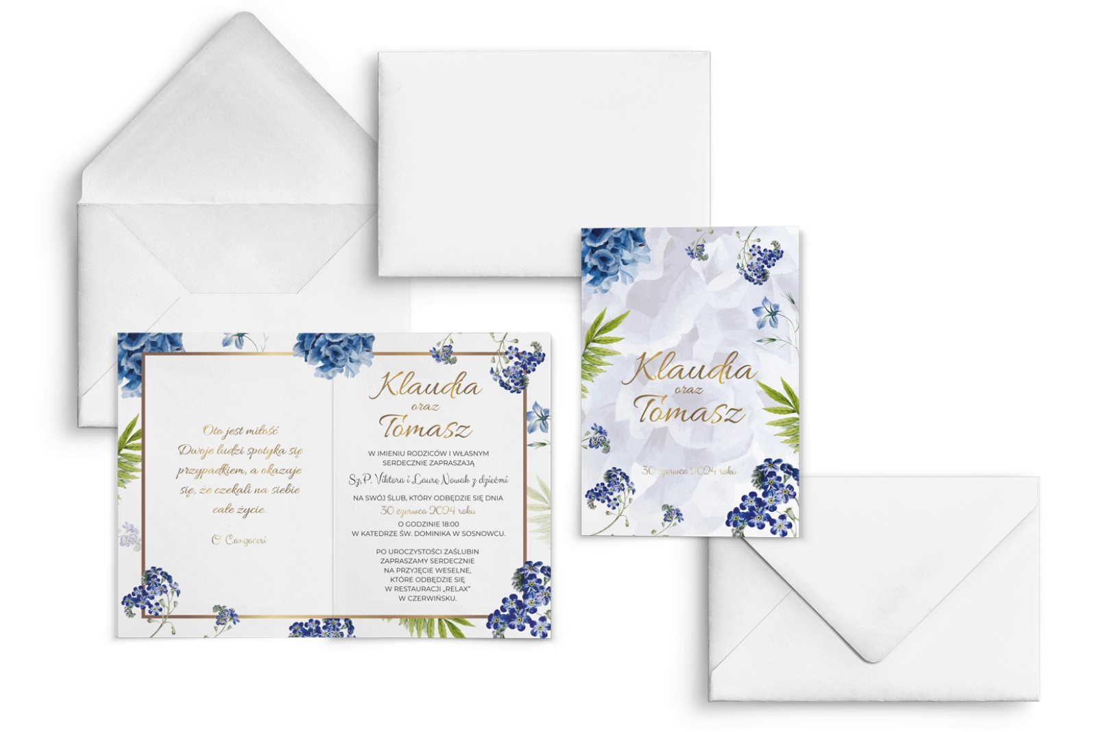 Eleganckie zaproszenia ślubne w których niebieskie hortensje otulają złotą ramkę. Drukowane na grubych papierach o różnych fakturach.