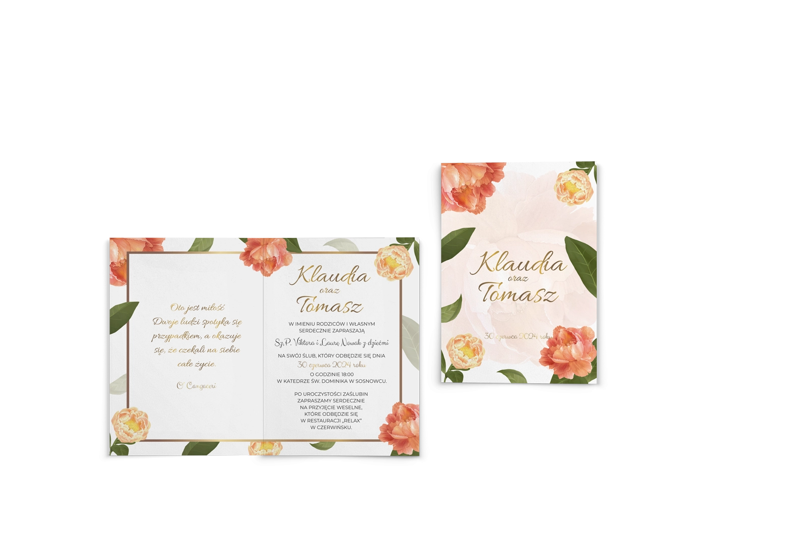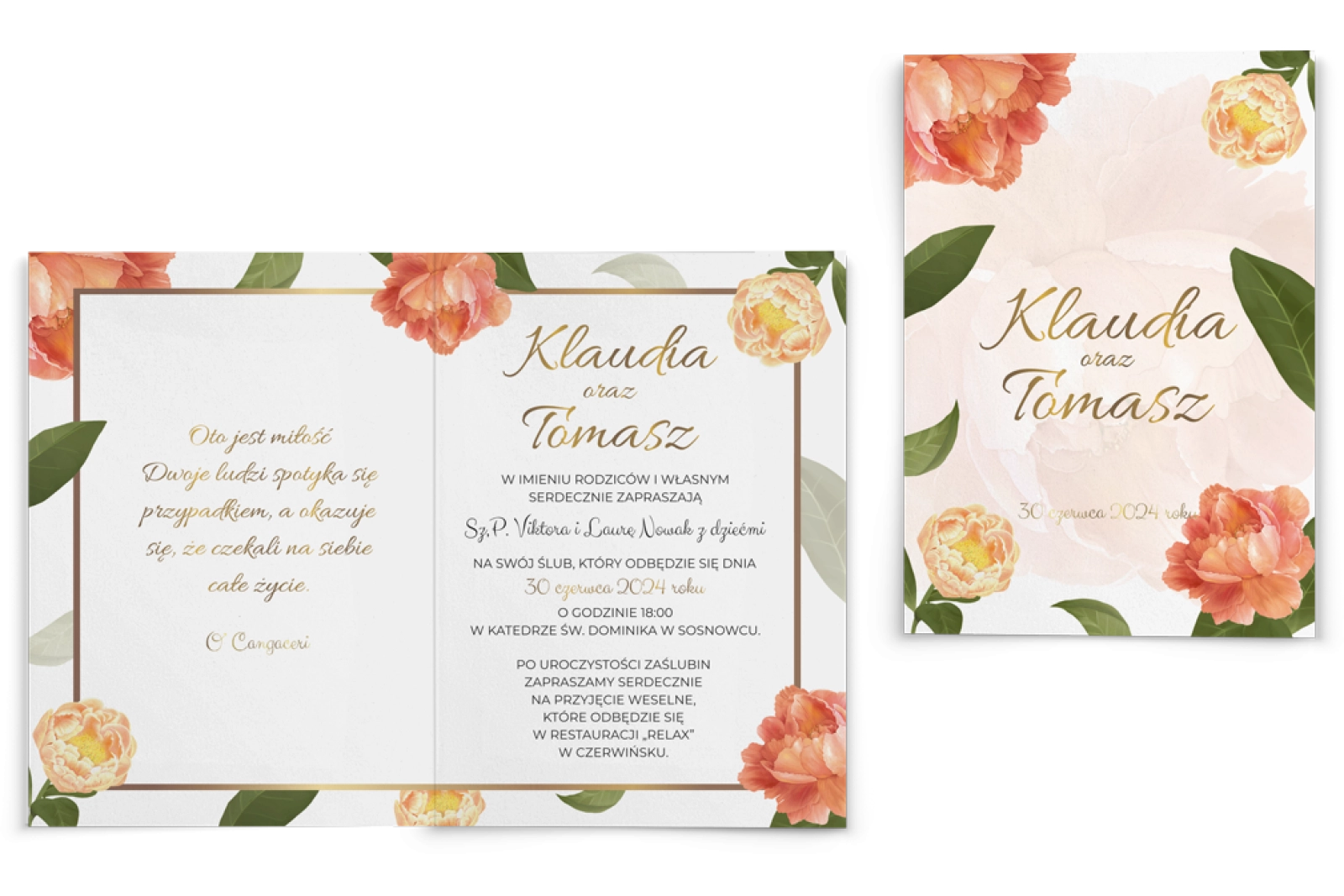 Eleganckie zaproszenia ślubne w których pomarańczowe piwonie otulają złotą ramkę. Drukowane na grubych papierach o różnych fakturach.
