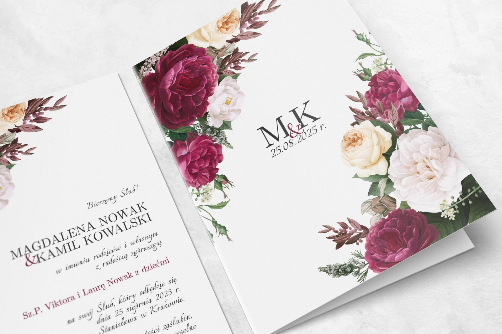 Oryginalne motywy kwiatowe zawarte na zaproszeniach dodadzą zaproszeniu romantyzmu. Mocny kolor kwiatów podkreśli elegancję a delikatna zieleń liści ożywi całe zaproszenie. Intensywne bordowe kolory w połączeniu z bielą papieru tworzą piękny efekt końcowy.