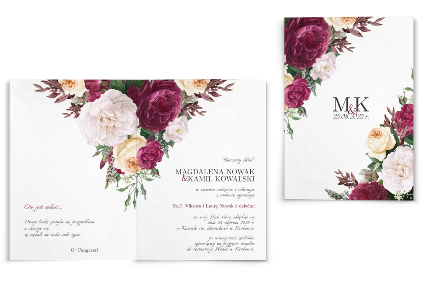 Oryginalne motywy kwiatowe zawarte na zaproszeniach dodadzą zaproszeniu romantyzmu. Mocny kolor kwiatów podkreśli elegancję a delikatna zieleń liści ożywi całe zaproszenie. Intensywne bordowe kolory w połączeniu z bielą papieru tworzą piękny efekt końcowy.