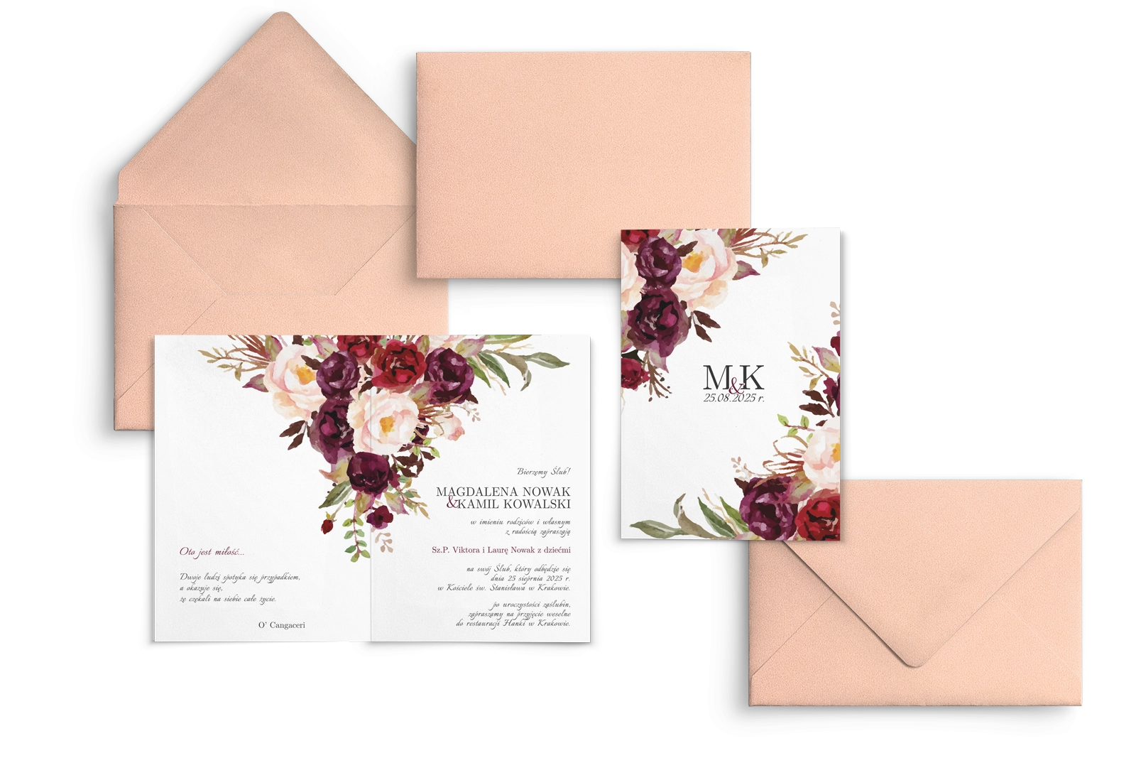Oryginalne motywy kwiatowe zawarte na zaproszeniach dodadzą zaproszeniu romantyzmu. Mocny kolor kwiatów podkreśli elegancję a delikatna zieleń liści ożywi całe zaproszenie. Intensywne bordowe kolory w połączeniu z bielą papieru tworzą piękny efekt końcowy.