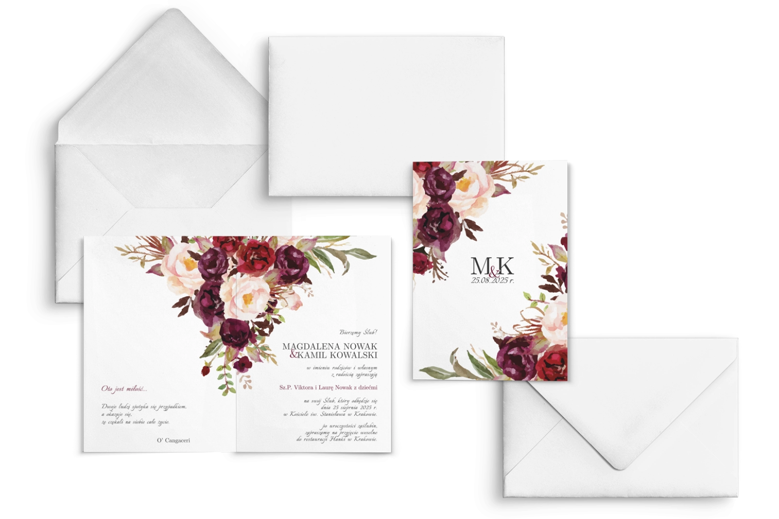 Oryginalne motywy kwiatowe zawarte na zaproszeniach dodadzą zaproszeniu romantyzmu. Mocny kolor kwiatów podkreśli elegancję a delikatna zieleń liści ożywi całe zaproszenie. Intensywne bordowe kolory w połączeniu z bielą papieru tworzą piękny efekt końcowy.