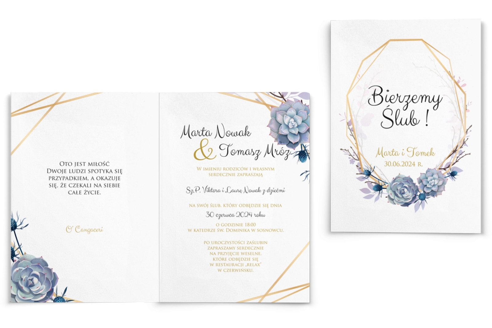 Wszystkie treści zaproszenia oraz dodatkowych wkładek są dowolnie personalizowane. Możesz zmienić każdą treść na swoim zaproszeniu. Podczas wypełniania Formularza Personalizacji opisz nam jak chcesz, aby wyglądało Twoje zaproszenie. Grafik przygotuje projekt skrojony specjalnie dla Ciebie.