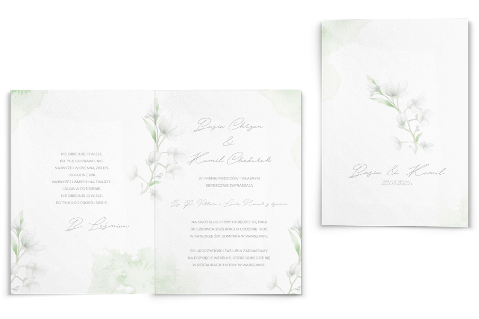 Wszystkie treści zaproszenia oraz dodatkowych wkładek są dowolnie personalizowane. Możesz zmienić każdą treść na swoim zaproszeniu. Podczas wypełniania Formularza Personalizacji opisz nam jak chcesz, aby wyglądało Twoje zaproszenie. Grafik przygotuje projekt skrojony specjalnie dla Ciebie.