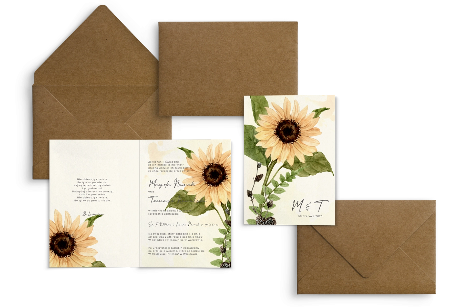 Wszystkie treści zaproszenia oraz dodatkowych wkładek są dowolnie personalizowane. Możesz zmienić każdą treść na swoim zaproszeniu. Podczas wypełniania Formularza Personalizacji opisz nam jak chcesz, aby wyglądało Twoje zaproszenie. Grafik przygotuje projekt skrojony specjalnie dla Ciebie.