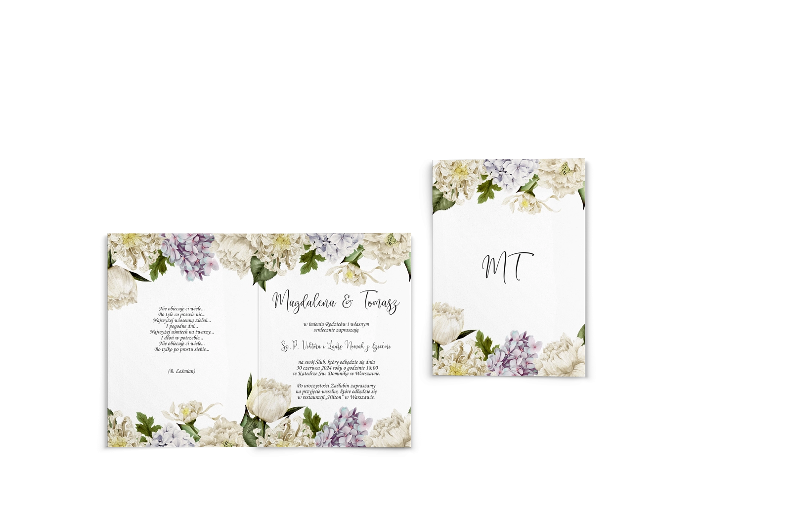 Piękne zaproszenia ślubne z jasnymi kwiatami chryzantem, bzu i peoni. Niezwykłe połączenie kwiatów o jasnych barwach tworzą ciekawą kompozycję. Sprawdź wszystkie możliwości personalizacji tego wzoru.