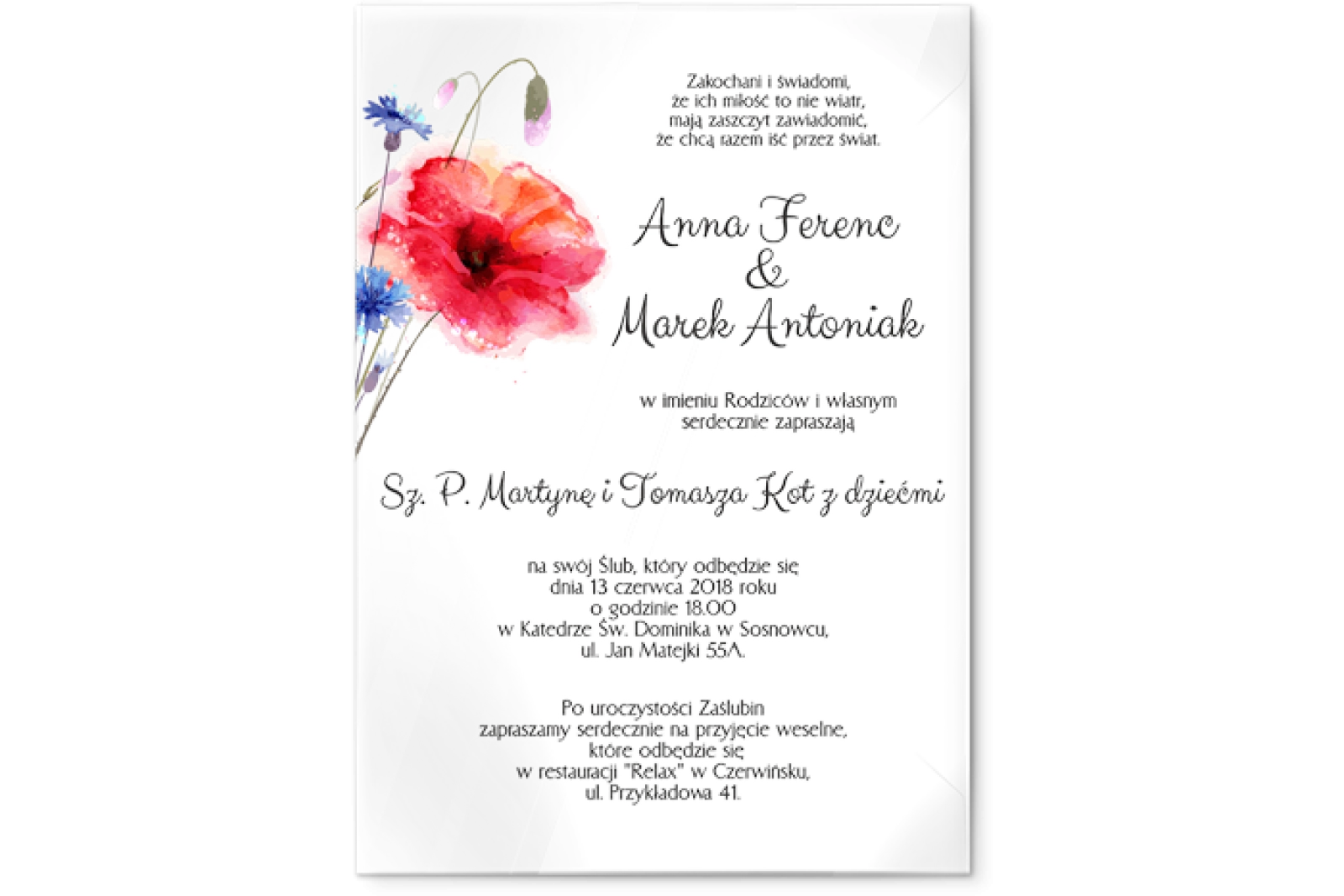 Udostępniamy możliwość zmiany Czcionek na zaproszeniu. W tym celu proszę skontaktuj się z nami mailowo, telefonicznie lub poprzez chat. Prześlemy do Ciebie zbiór Czcionek, który możesz wykorzystać na swoim zaproszeniu.