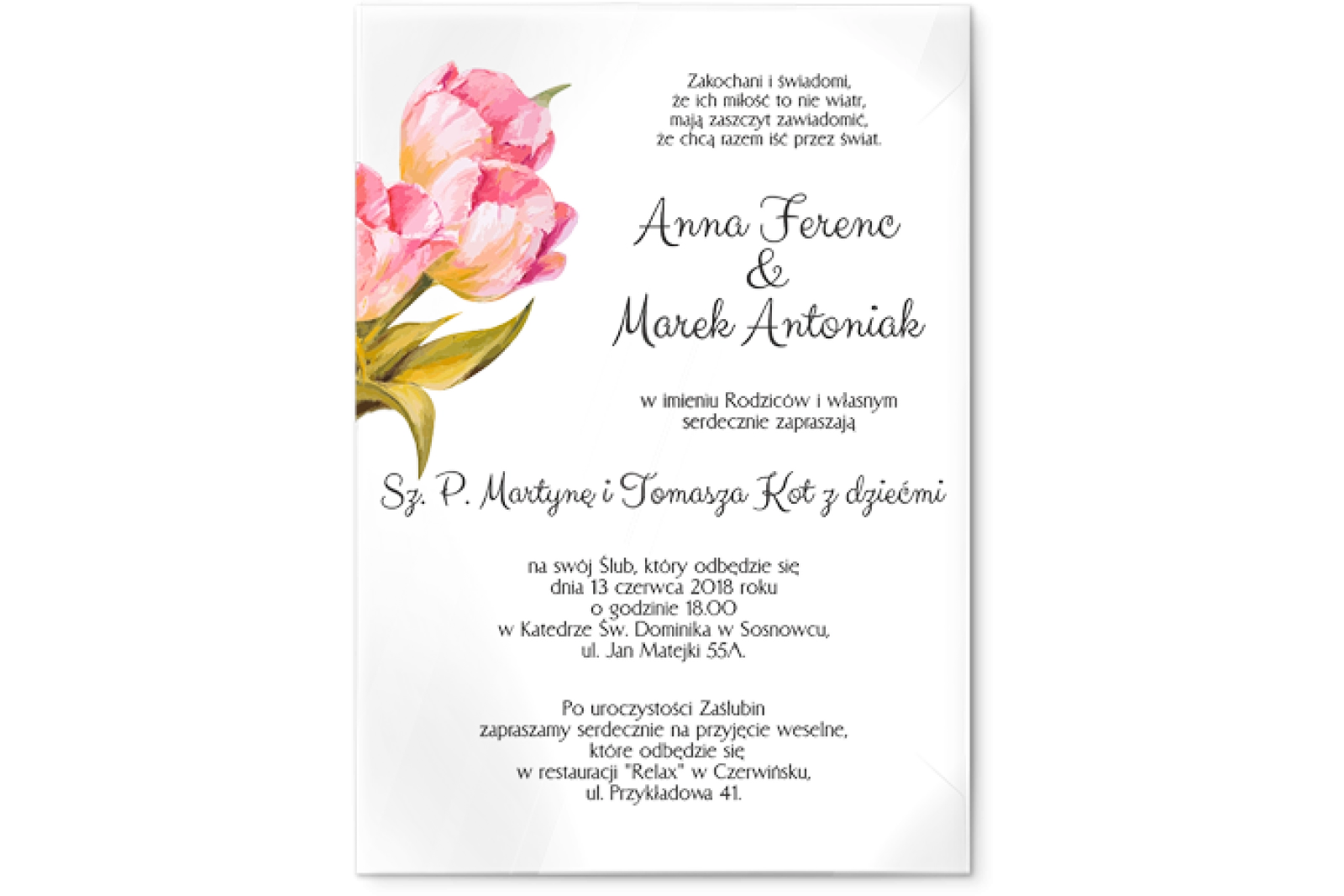 Wszystkie treści zaproszenia oraz dodatkowych wkładek są dowolnie personalizowane. Możesz zmienić każdą treść na swoim zaproszeniu. Podczas wypełniania Formularza Personalizacji opisz nam jak chcesz, aby wyglądało Twoje zaproszenie. Grafik przygotuje projekt skrojony specjalnie dla Ciebie.