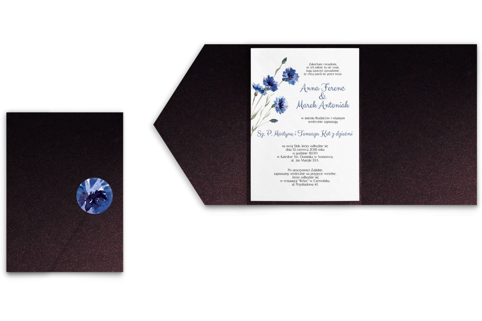 Wszystkie treści zaproszenia oraz dodatkowych wkładek są dowolnie personalizowane. Możesz zmienić każdą treść na swoim zaproszeniu. Podczas wypełniania Formularza Personalizacji opisz nam jak chcesz, aby wyglądało Twoje zaproszenie. Grafik przygotuje projekt skrojony specjalnie dla Ciebie.