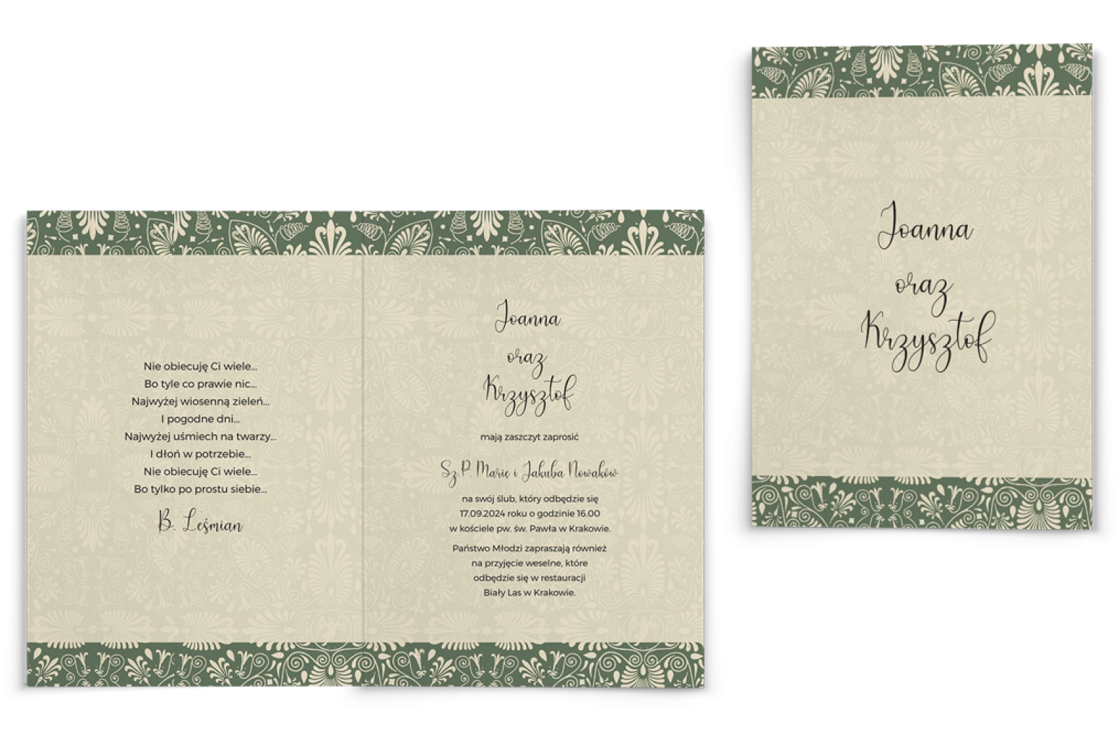 Wszystkie treści zaproszenia oraz dodatkowych wkładek są dowolnie personalizowane. Możesz zmienić każdą treść na swoim zaproszeniu. Podczas wypełniania Formularza Personalizacji opisz nam jak chcesz, aby wyglądało Twoje zaproszenie. Grafik przygotuje projekt skrojony specjalnie dla Ciebie.