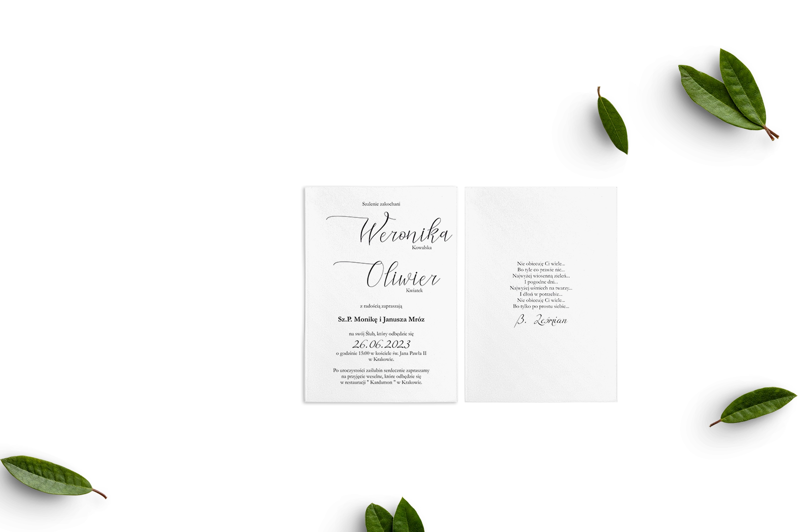 Wszystkie treści zaproszenia oraz dodatkowych wkładek są dowolnie personalizowane. Możesz zmienić każdą treść na swoim zaproszeniu. Podczas wypełniania Formularza Personalizacji opisz nam jak chcesz, aby wyglądało Twoje zaproszenie. Grafik przygotuje projekt skrojony specjalnie dla Ciebie.