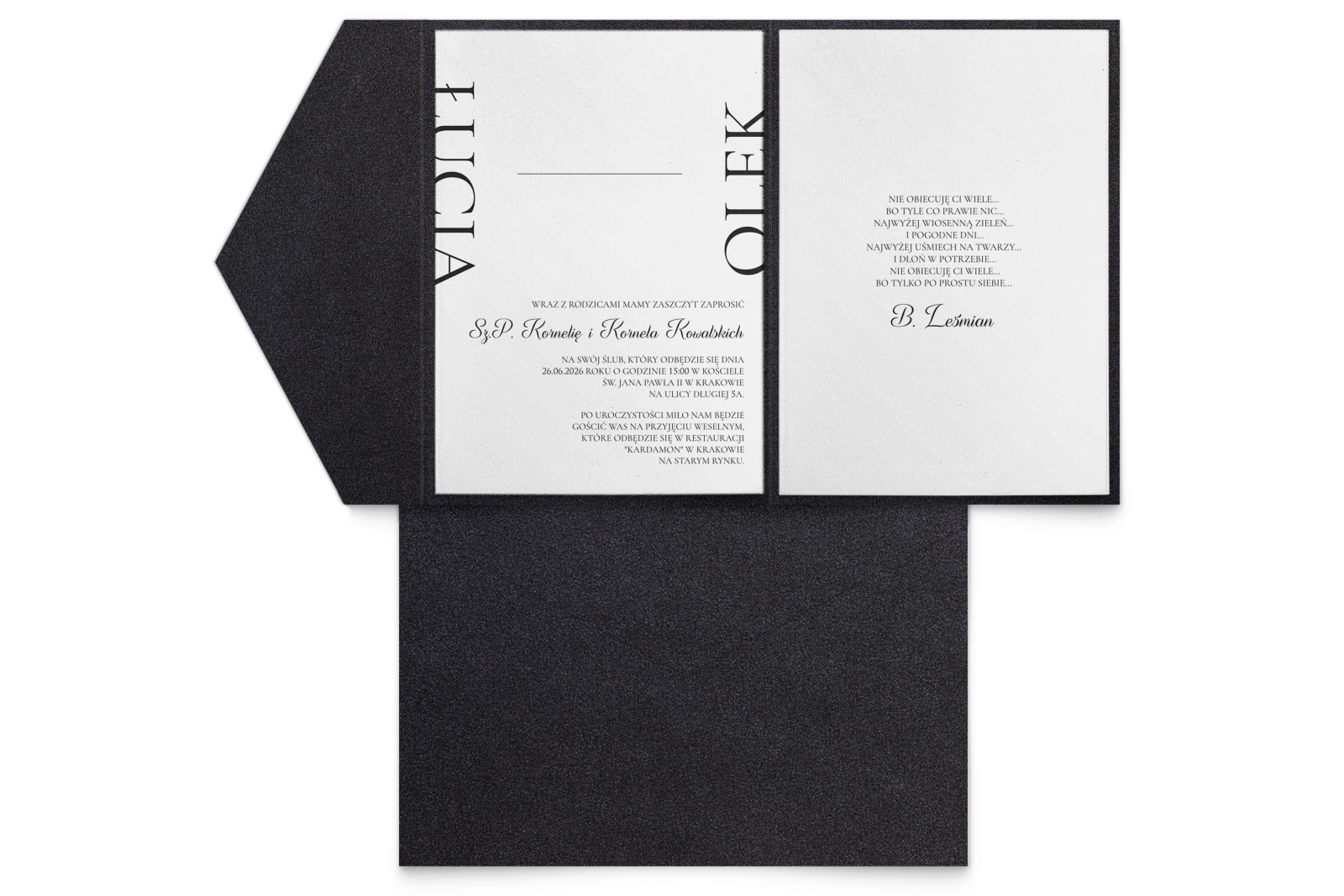 Wszystkie treści zaproszenia oraz dodatkowych wkładek są dowolnie personalizowane. Możesz zmienić każdą treść na swoim zaproszeniu. Podczas wypełniania Formularza Personalizacji opisz nam jak chcesz, aby wyglądało Twoje zaproszenie. Grafik przygotuje projekt skrojony specjalnie dla Ciebie.