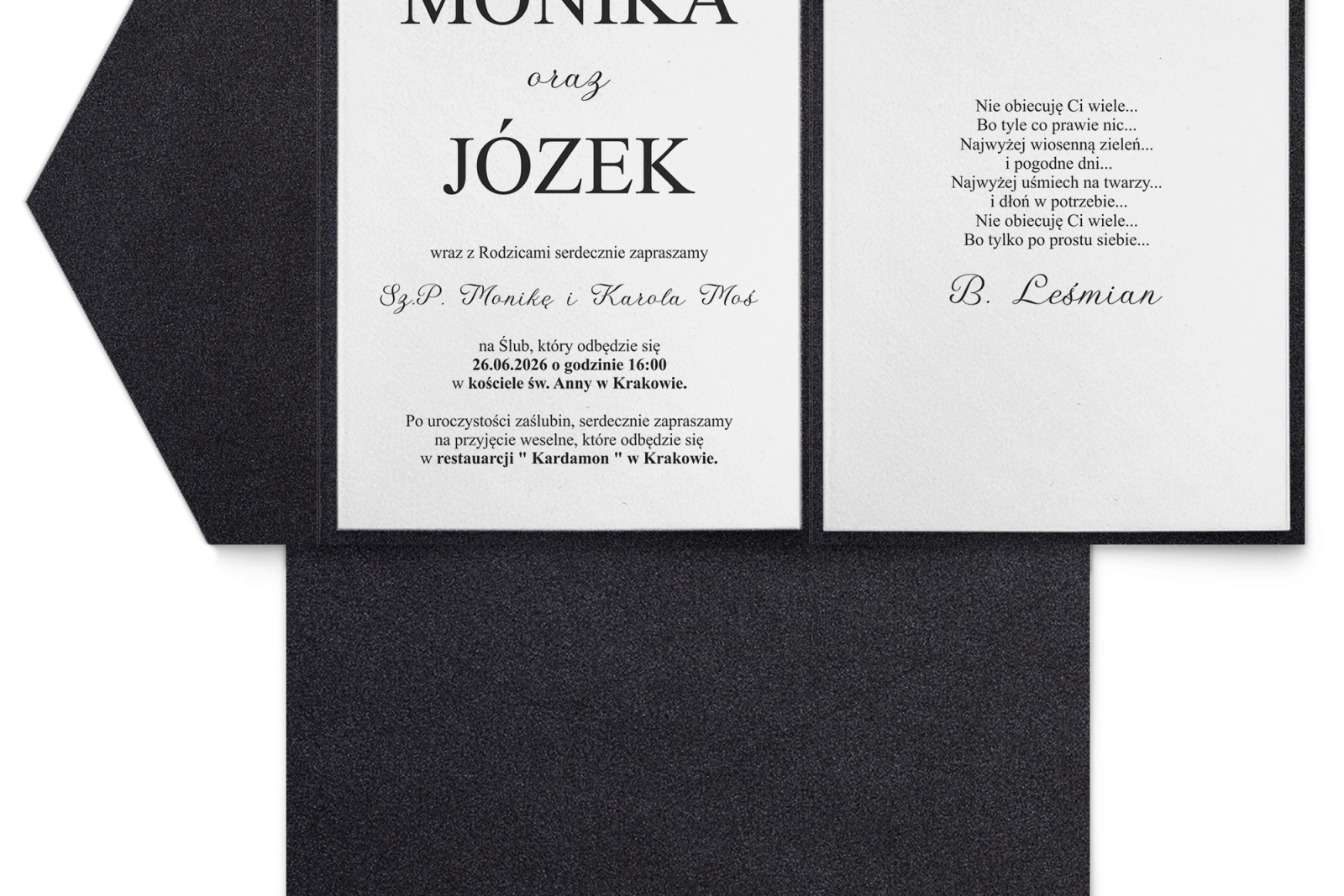 Wszystkie treści zaproszenia oraz dodatkowych wkładek są dowolnie personalizowane. Możesz zmienić każdą treść na swoim zaproszeniu. Podczas wypełniania Formularza Personalizacji opisz nam jak chcesz, aby wyglądało Twoje zaproszenie. Grafik przygotuje projekt skrojony specjalnie dla Ciebie.