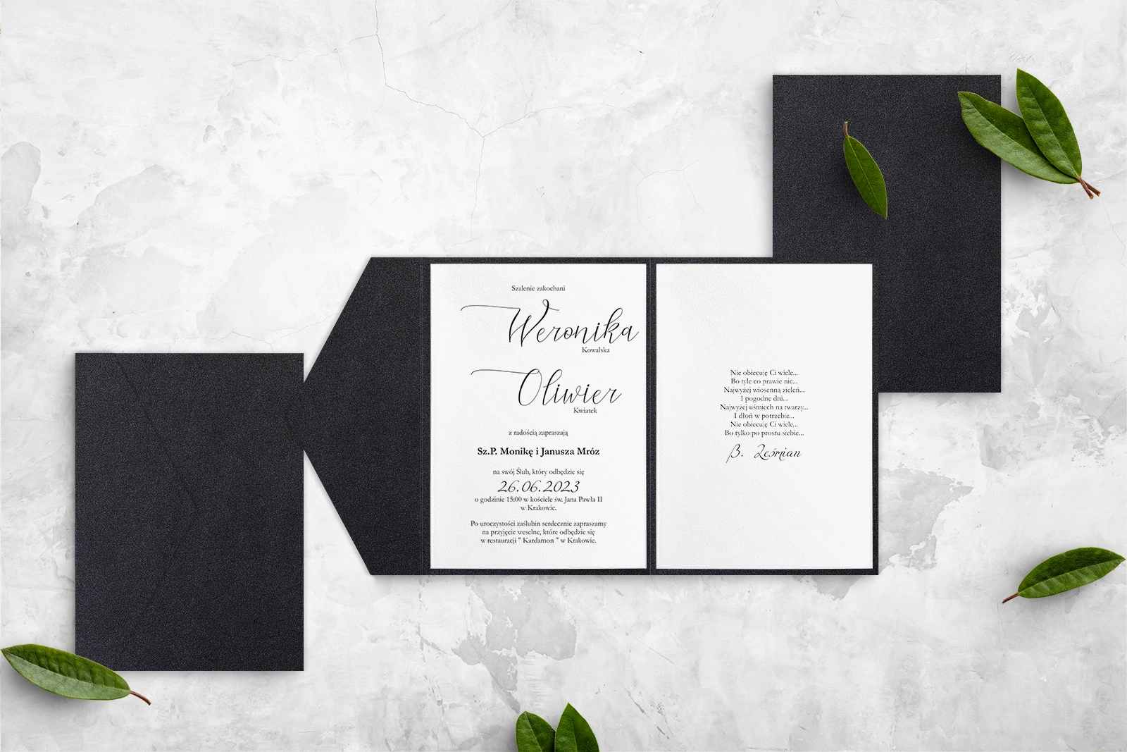 Wszystkie treści zaproszenia oraz dodatkowych wkładek są dowolnie personalizowane. Możesz zmienić każdą treść na swoim zaproszeniu. Podczas wypełniania Formularza Personalizacji opisz nam jak chcesz, aby wyglądało Twoje zaproszenie. Grafik przygotuje projekt skrojony specjalnie dla Ciebie.