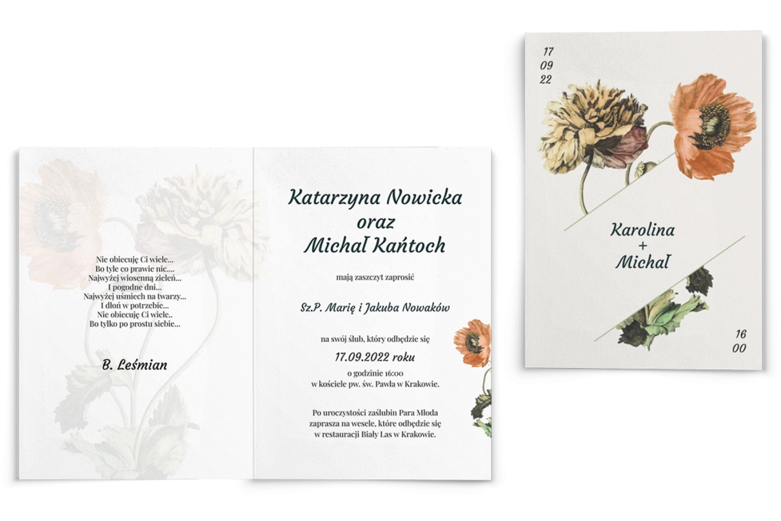 Wszystkie treści zaproszenia oraz dodatkowych wkładek są dowolnie personalizowane. Możesz zmienić każdą treść na swoim zaproszeniu. Podczas wypełniania Formularza Personalizacji opisz nam jak chcesz, aby wyglądało Twoje zaproszenie. Grafik przygotuje projekt skrojony specjalnie dla Ciebie.
