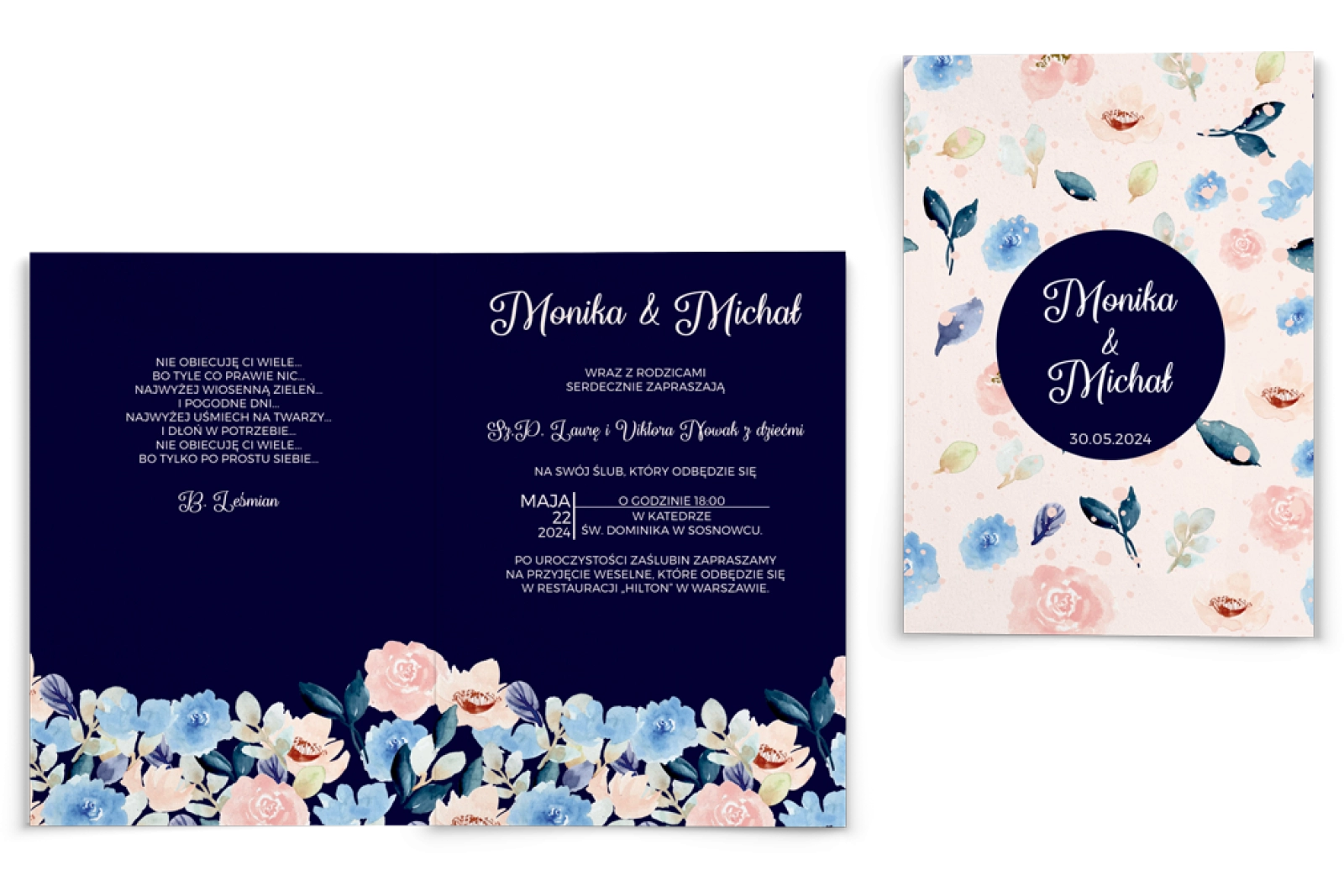 Wszystkie treści zaproszenia oraz dodatkowych wkładek są dowolnie personalizowane. Możesz zmienić każdą treść na swoim zaproszeniu. Podczas wypełniania Formularza Personalizacji opisz nam jak chcesz, aby wyglądało Twoje zaproszenie. Grafik przygotuje projekt skrojony specjalnie dla Ciebie.