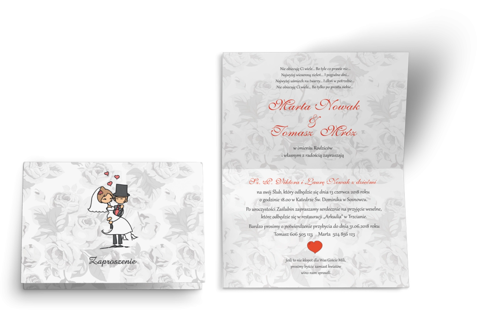 Rysunkowe zaproszenia ślubne przedstawiające parę młodą. Możecie wybrać jeden z dwóch kolorów. Pierwszy to kolor jasny w klasyczne delikatnie szare róże, druki to kolor czerwony w romantyczne maki. Doskonałym uzupełnieniem tego wzoru są koperty krzyżowe oraz dodatkowe wkładki.