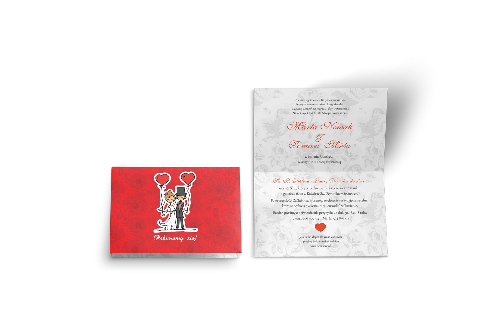 Zaproszenia ślubne z kolekcji zakochani z motywem zabawnej pary młodej w różnych scenkach. Ta romantyczna sytuacja może zostać przedstawiona na dwóch tłach: czerwonym w maki lub szarym w róże. Możecie również wybrać jeden z trzech rodzajów kopert oraz dodatkowe wkładki, które doskonale uzupełniają zaproszenie.