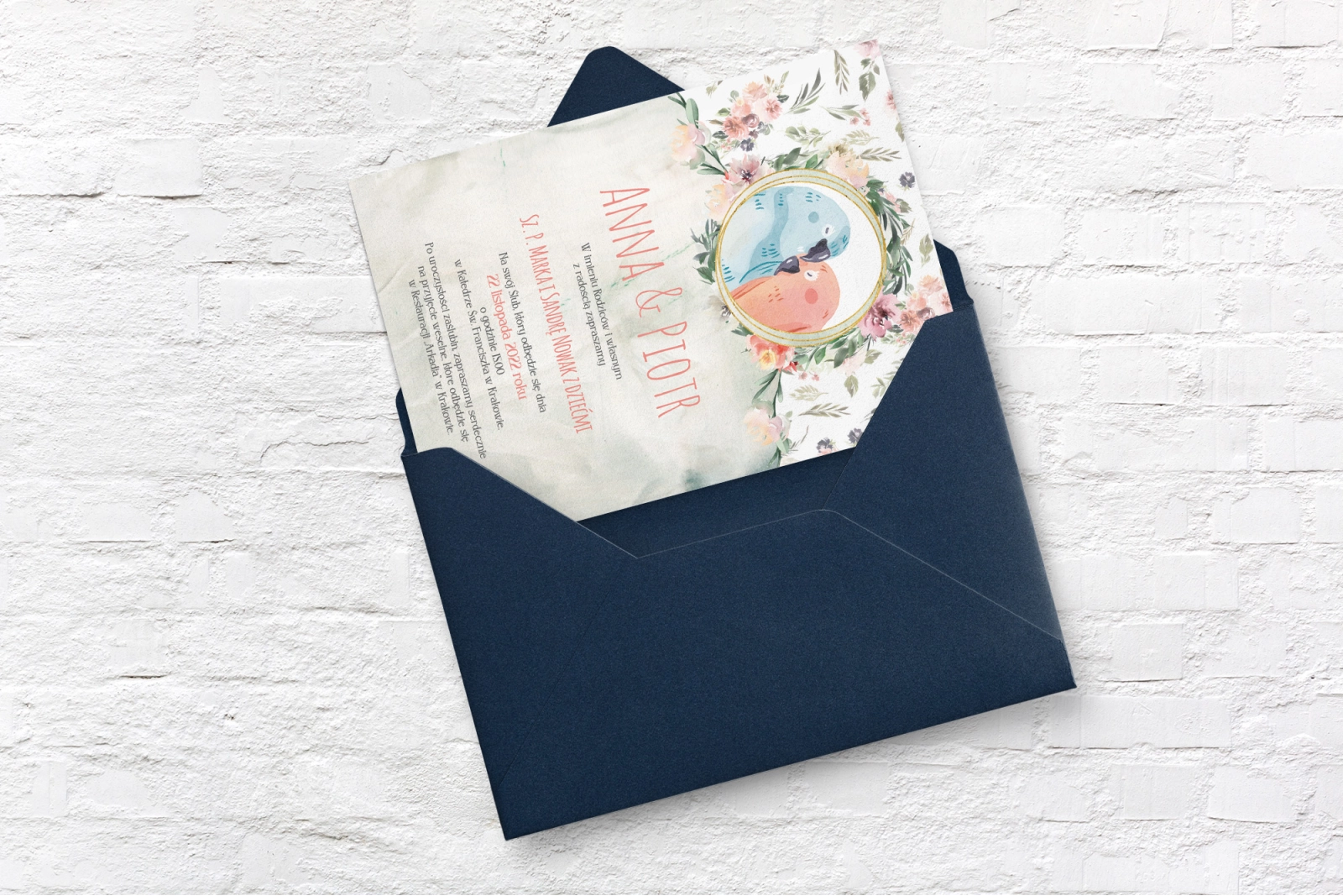 Wszystkie treści zaproszenia oraz dodatkowych wkładek są dowolnie personalizowane. Możesz zmienić każdą treść na swoim zaproszeniu. Podczas wypełniania Formularza Personalizacji opisz nam jak chcesz, aby wyglądało Twoje zaproszenie. Grafik przygotuje projekt skrojony specjalnie dla Ciebie.