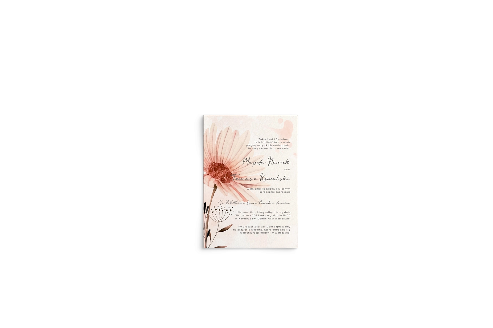 Wszystkie treści zaproszenia oraz dodatkowych wkładek są dowolnie personalizowane. Możesz zmienić każdą treść na swoim zaproszeniu. Podczas wypełniania Formularza Personalizacji opisz nam jak chcesz, aby wyglądało Twoje zaproszenie. Grafik przygotuje projekt skrojony specjalnie dla Ciebie.