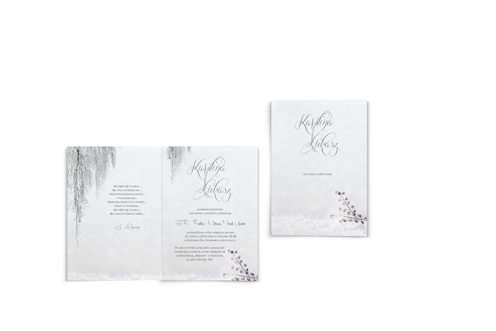 Delikatne zaproszenia ślubne z motywem zimowym. W tle nadrukowane subtelne płatki śniegu, stanowią idealne tło zimowej scenerii. Poprzez dobór odpowiedniej czcionki i grafiki zaproszenia wpasują się w wesele w zimowej i świątecznej porze roku.
