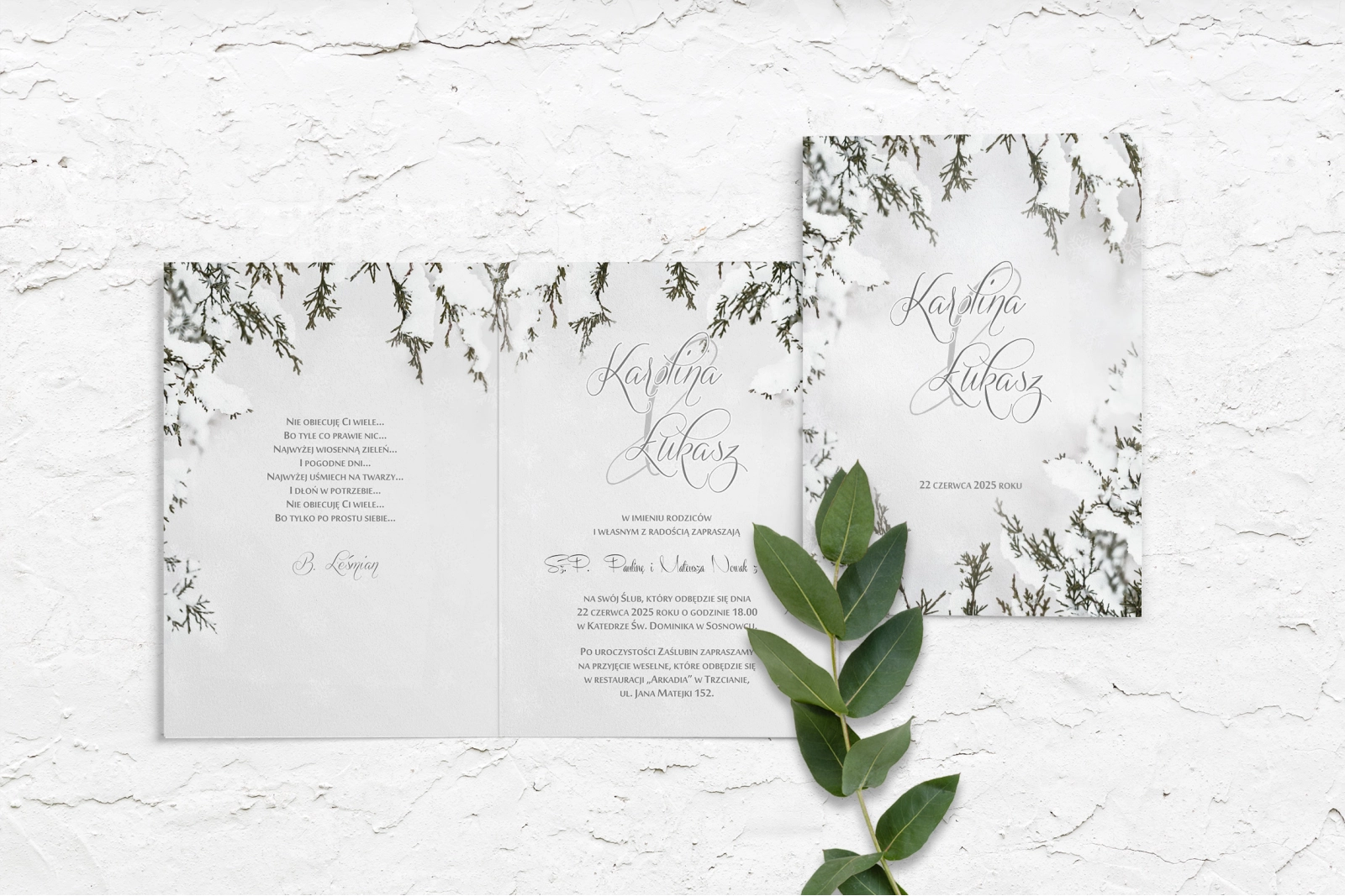 Delikatne zaproszenia ślubne z motywem zimowym. W tle nadrukowane subtelne płatki śniegu, stanowią idealne tło zimowej scenerii. Poprzez dobór odpowiedniej czcionki i grafiki zaproszenia wpasują się w wesele w zimowej i świątecznej porze roku.