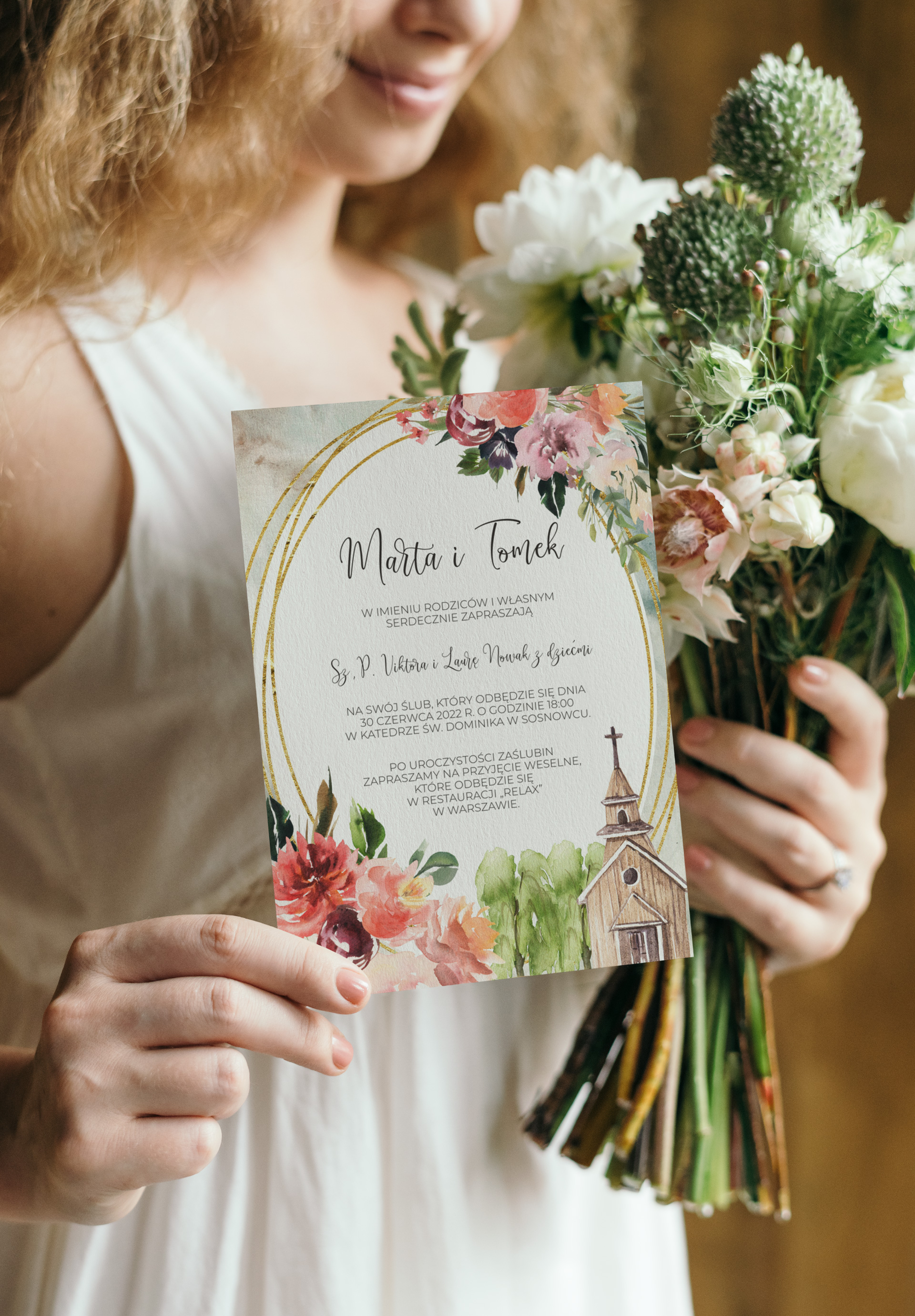 Delikatne kwiaty w połączeniu z motywem weselnym utrzymane w akwarelowym stylu.