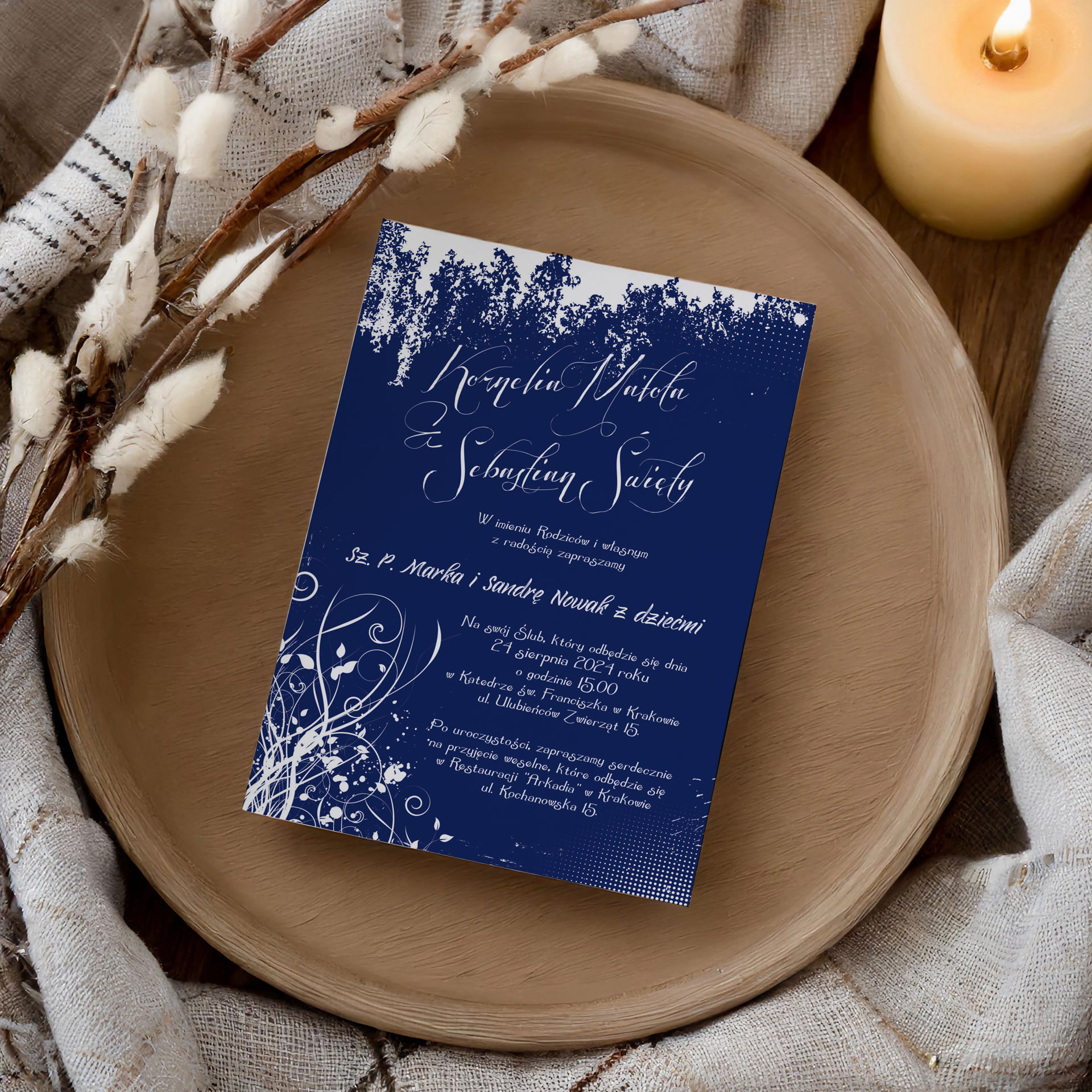 Wszystkie treści zaproszenia oraz dodatkowych wkładek są dowolnie personalizowane. Możesz zmienić każdą treść na swoim zaproszeniu. Podczas wypełniania Formularza Personalizacji opisz nam jak chcesz, aby wyglądało Twoje zaproszenie. Grafik przygotuje projekt skrojony specjalnie dla Ciebie.