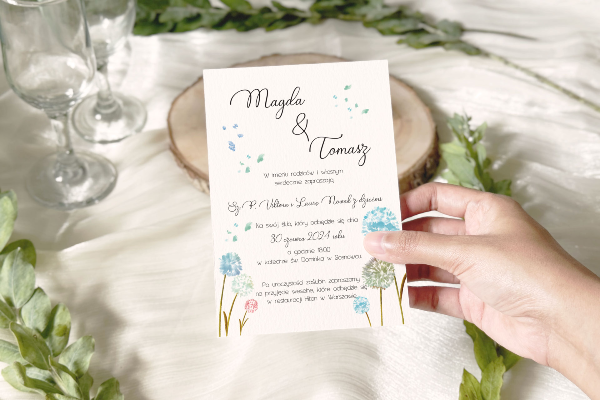 Zaproszenia Biały Czas to piękne połączenie kolorowych kwiatów wraz z cudowną czcionką, która idealnie wkomponuje się w każdy styl wesela.
