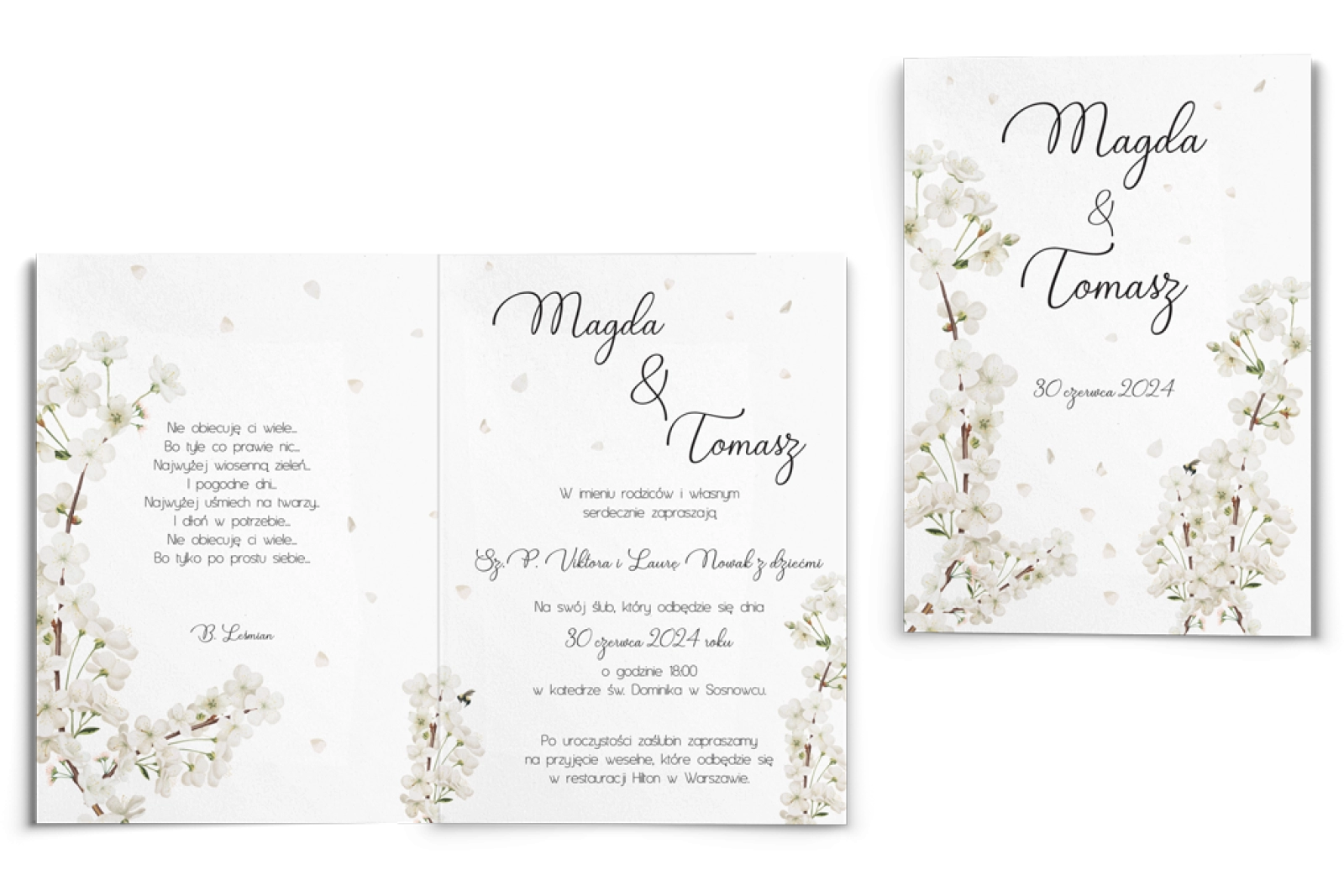 Zaproszenia Biały Czas to piękne połączenie białych kwiatów wraz z cudowną czcionką, która idealnie wkomponuje się w każdy styl wesela.