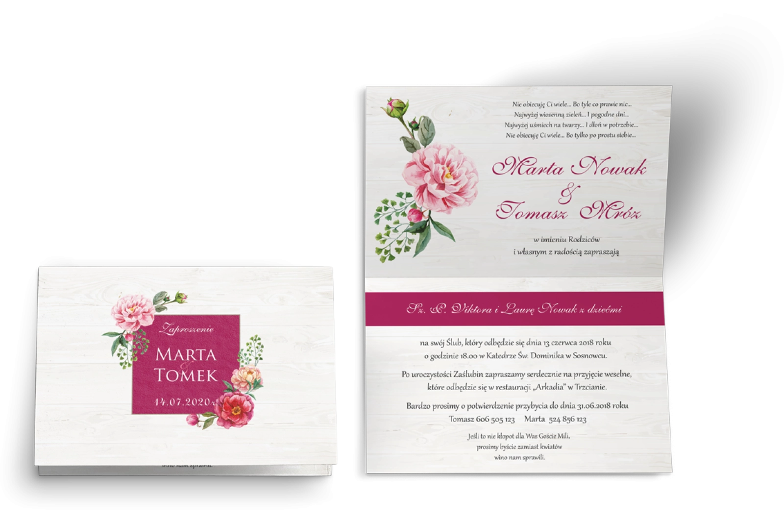 Sztywne i piękne zaproszenia ślubne o bardzo eleganckim blasku i pięknych kolorach z motywami kwiatów na tle białych desek. Klasyczne wzory, wykonane na gładkich i fakturowanych papierach, które oczarują każdego. Dopracowane i w pełni personalizowane zaproszenia. Biała koperta gratis lub sam dopasuj kolor koperty.