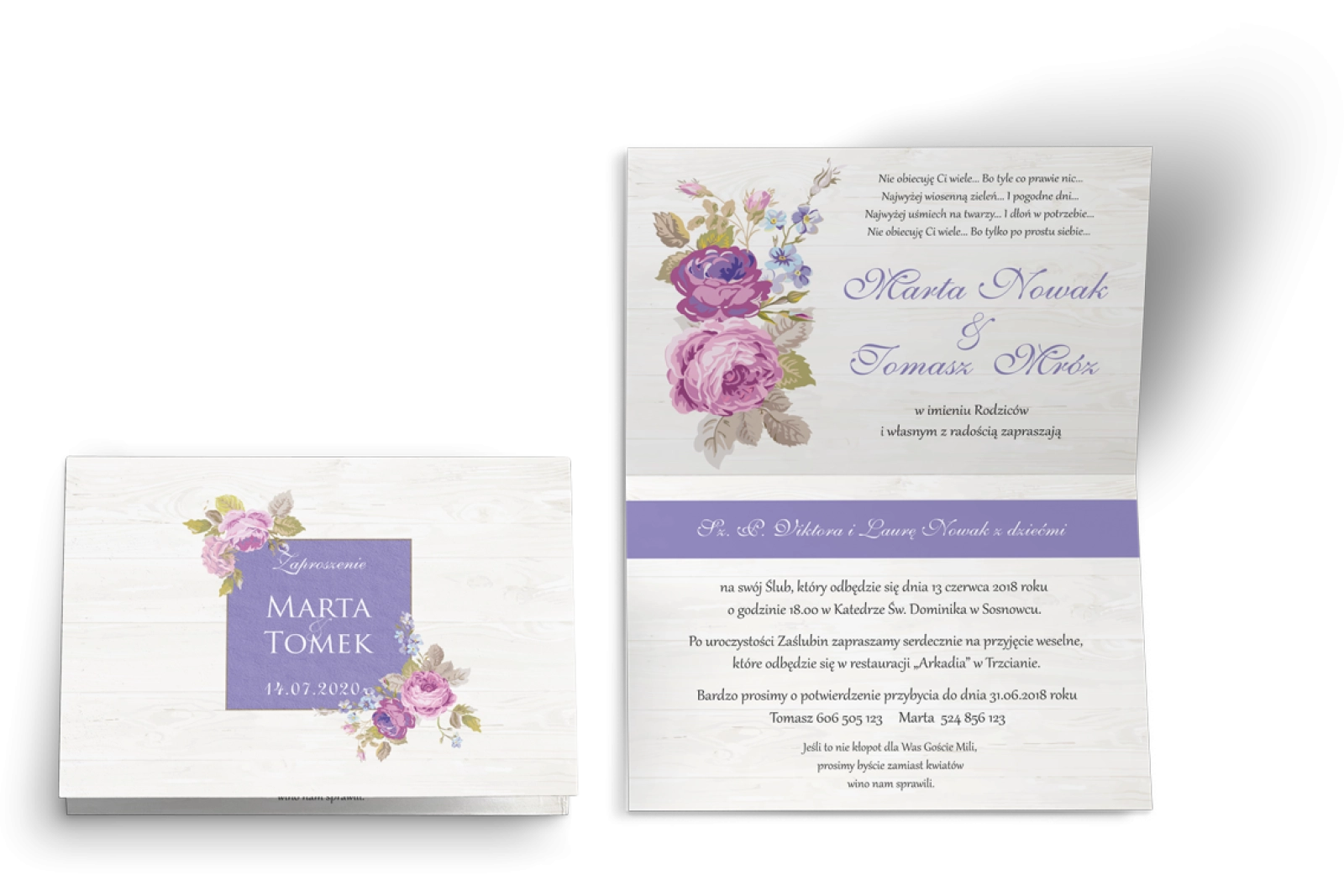 Sztywne i piękne zaproszenia ślubne o bardzo eleganckim blasku i pięknych kolorach z motywami kwiatów na tle białych desek. Klasyczne wzory, wykonane na gładkich i fakturowanych papierach, które oczarują każdego. Dopracowane i w pełni personalizowane zaproszenia. Biała koperta gratis lub sam dopasuj kolor koperty.