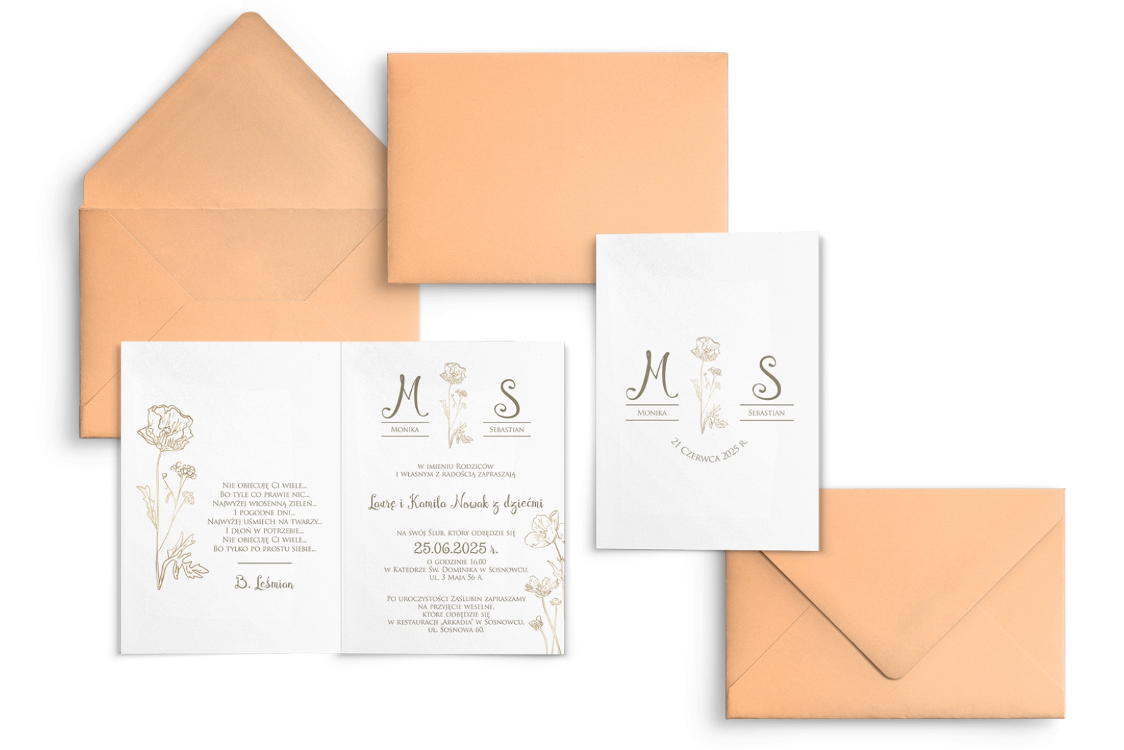 Wszystkie treści zaproszenia oraz dodatkowych wkładek są dowolnie personalizowane. Możesz zmienić każdą treść na swoim zaproszeniu. Podczas wypełniania Formularza Personalizacji opisz nam jak chcesz, aby wyglądało Twoje zaproszenie. Grafik przygotuje projekt skrojony specjalnie dla Ciebie.