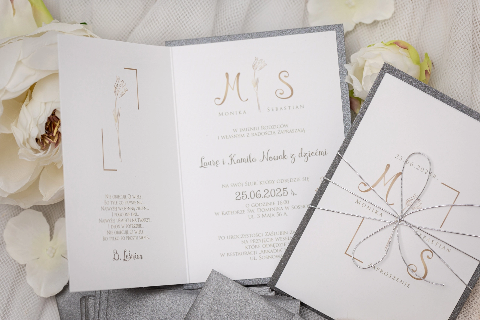 Każda perła jest aplikowana indywidualnie, co sprawia, że każde zaproszenie staje się niepowtarzalne. Ze względu na ręczne wykonanie, układ perełek może delikatnie różnić się między egzemplarzami.