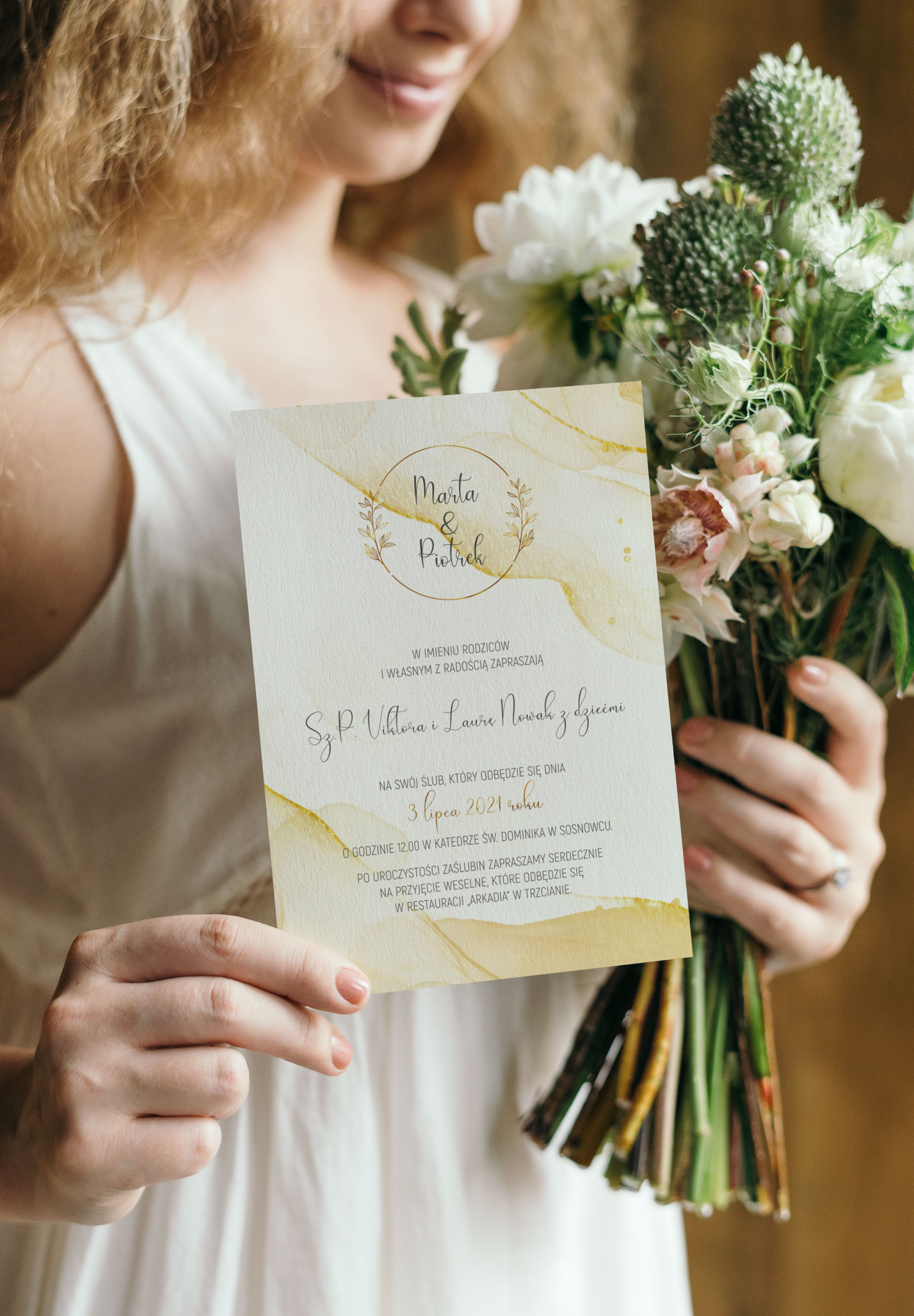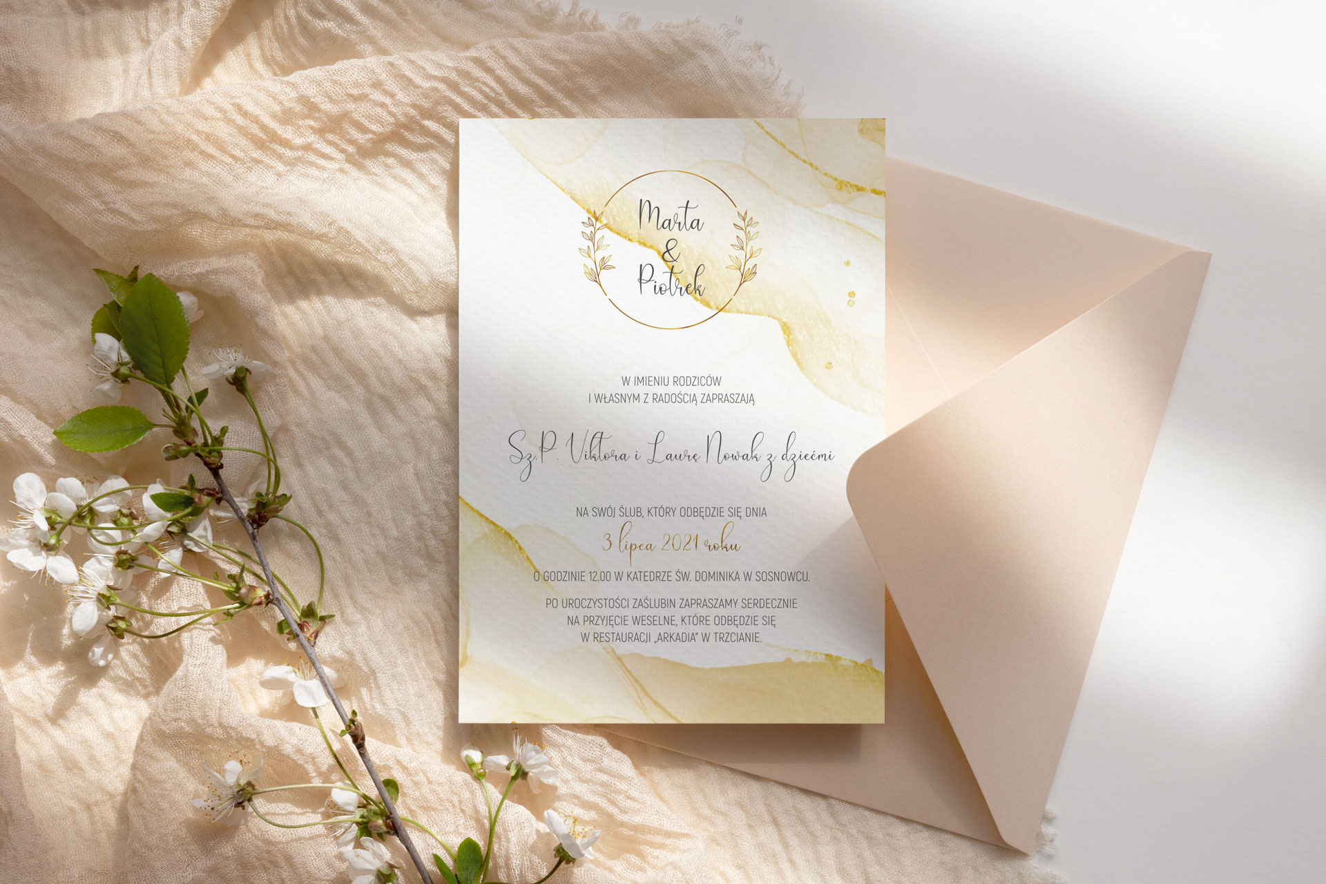 Kolekcja Glamour Ink to połączenie tuszowych plam tworzących interesujące tekstury ze złotymi, eleganckimi zdobieniami. Kolorystyka zaproszeń nawiązuje do natury – roślin, wody oraz piasku.