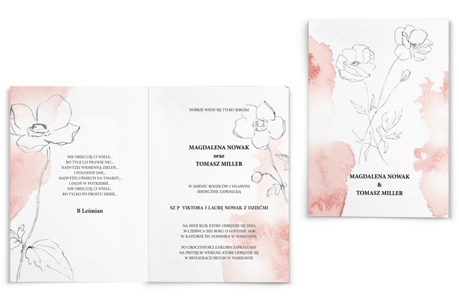 Akwarelowe zaproszenia zdobione przez imitację rozlanej farby w stonowanej kolorystyce różu. Głównym zdobieniem tego zaproszenia jest szkicowany kwiat w ciemnej kolorystyce. Całość tworzy bardzo nowoczesne z zarazem eleganckie zaproszenie. Kombinacja ta jest alternatywą dla zaproszeń o wielobarwnych kwiatach.