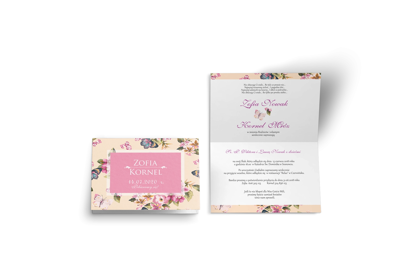 Wszystkie treści zaproszenia oraz dodatkowych wkładek są dowolnie personalizowane. Możesz zmienić każdą treść na swoim zaproszeniu. Podczas wypełniania Formularza Personalizacji opisz nam jak chcesz, aby wyglądało Twoje zaproszenie. Grafik przygotuje projekt skrojony specjalnie dla Ciebie.