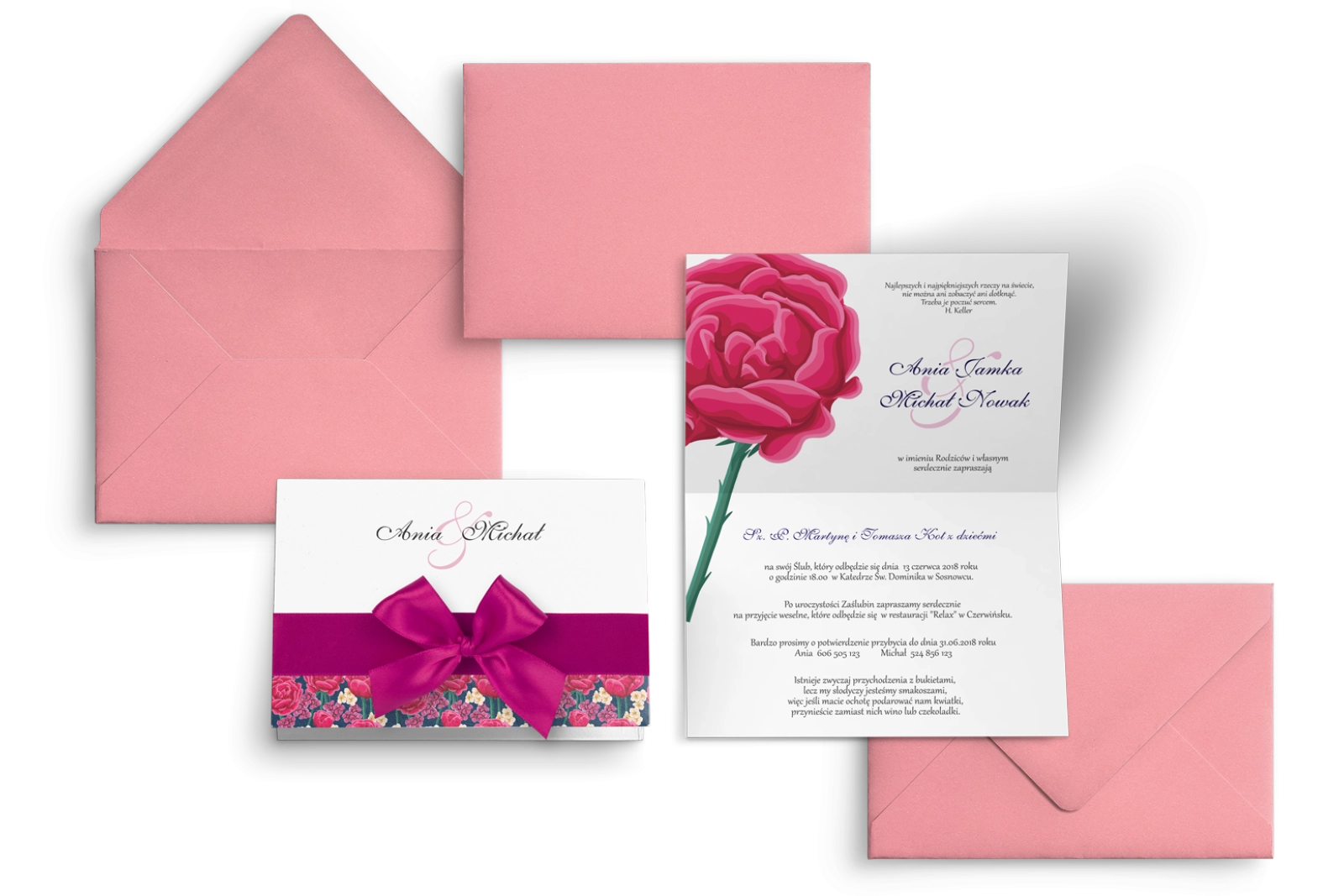 Wszystkie treści zaproszenia oraz dodatkowych wkładek są dowolnie personalizowane. Możesz zmienić każdą treść na swoim zaproszeniu. Podczas wypełniania Formularza Personalizacji opisz nam jak chcesz, aby wyglądało Twoje zaproszenie. Grafik przygotuje projekt skrojony specjalnie dla Ciebie.
