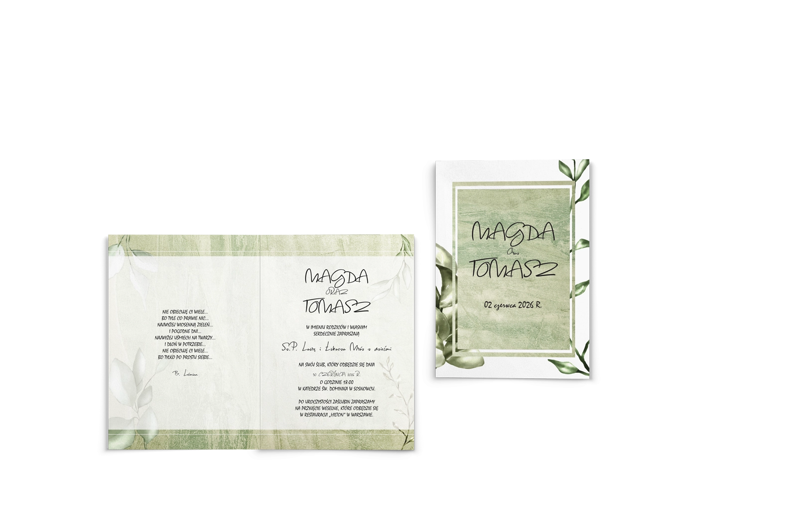 Zaproszenie ślubne Mgiełka łączy w sobie liście z kwiatami, które znajdziemy na każdej polanie wraz z nutką porannej mgiełki.
